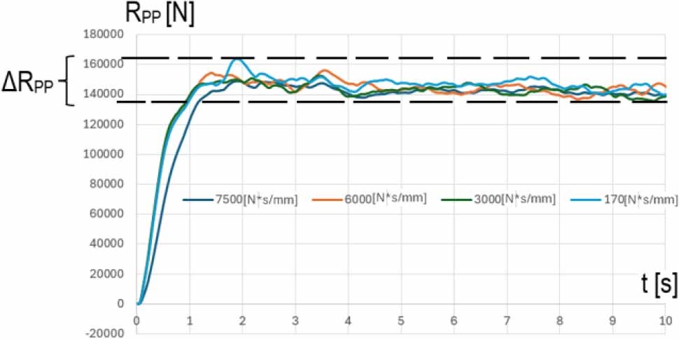 The graphs of the pressure forces of the wagon wheels on the rails, especially in the downforce phases, confirm that the values of the contact forces in the kinematic pairs decrease with the increase of damping.