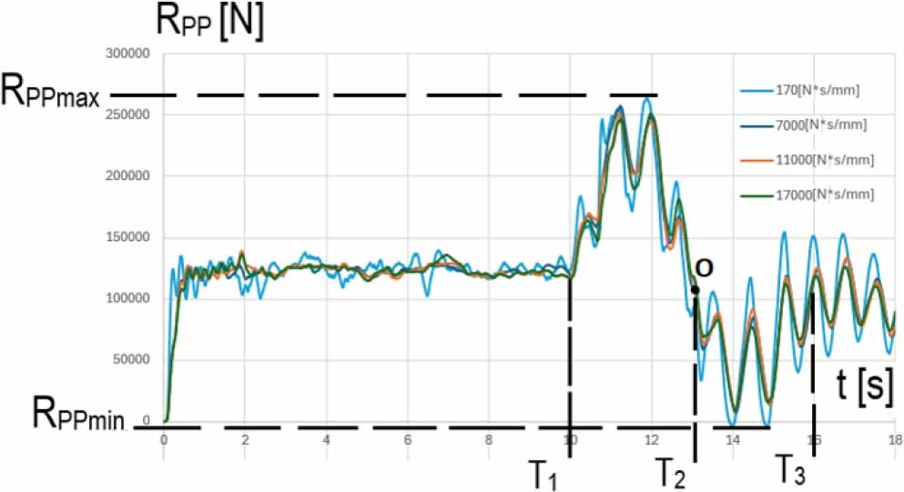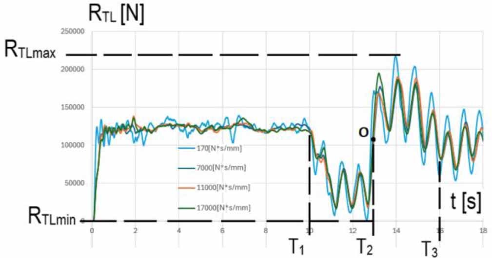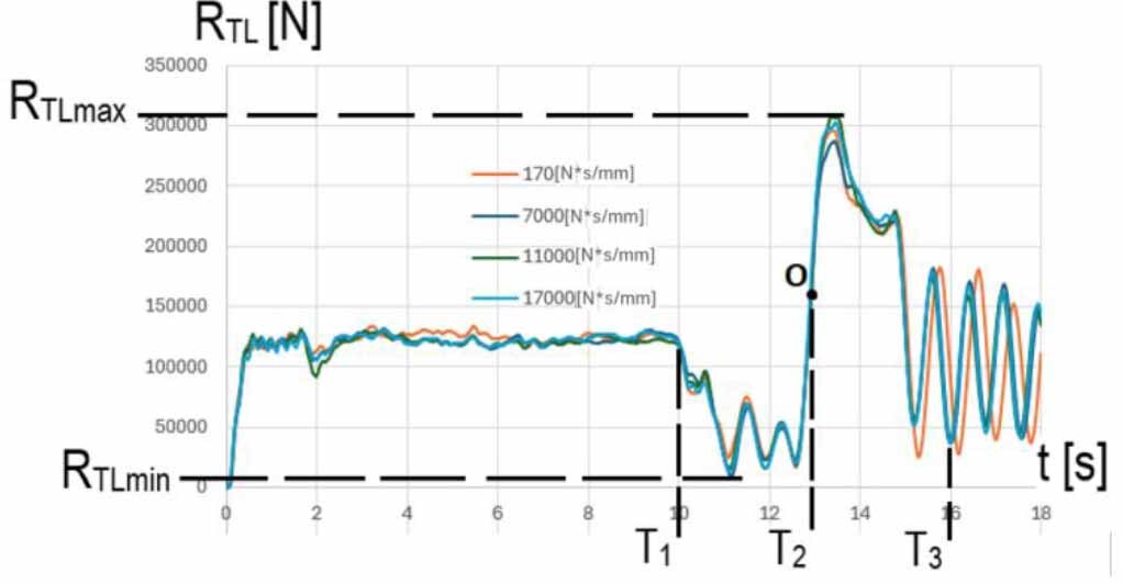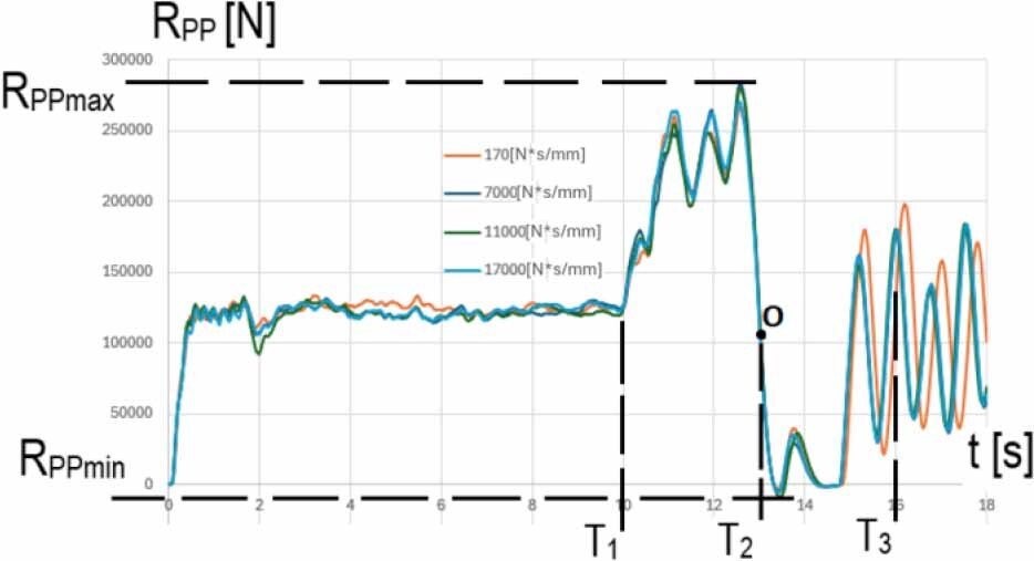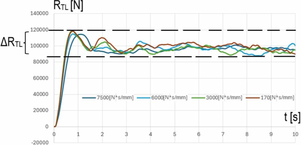 On the basis of the results of the wagon motion simulations, it was found that the front right wheel while driving in the CL curve (T1-T2 interval) is pressed against the track with the maximum force RPPmax (V = 120 km/h) = 283 kN – Fig. 21, while the rear left wheel of the wagon is relieved in this phase of motion with the possibility of a short-term separation of the wheel from the track: for V = 100 km/h and damping Cmin, RTLmun=~ 0 kN – Table 2 and Fig. 20.