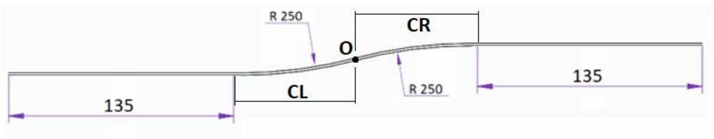 Configuration and dimensions of the curved track; CL – curvature to the left, CR – curvature to the right, O – point of inflection of the curvature/change of direction of track curvature