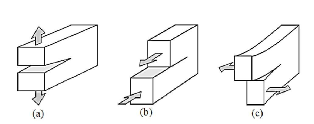 The Three Fundamental Modes of Crack Tip Deformation: (a) Mode I - Opening; (b) Mode II - Sliding; (c) Mode III - Tearing