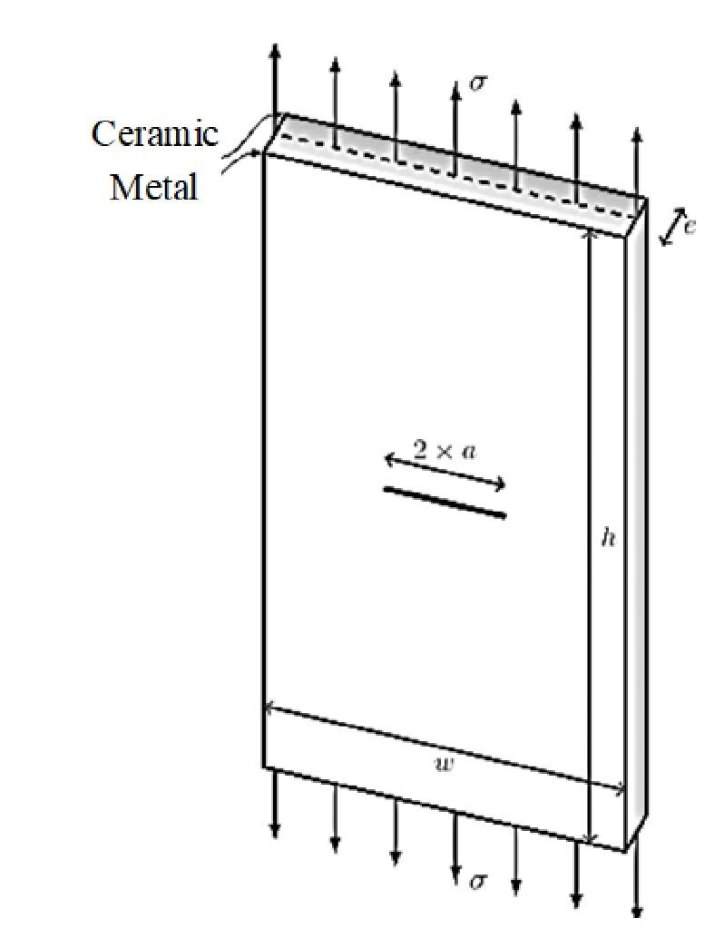 The numerical model consists of a functionally graded material (FGM) plate made of ceramic and metal, as shown in Fig. 5. Width W = 125mm, Height h = 250mm, Thickness e = 2mm. FGM structure changes material properties from ceramic top to metal bottom to resist crack and increase durability. This slow change reduces stress buildup and the plate is better at stopping crack from spreading and lasting longer [33]. The plate is subjected to stress test at 3 levels: 50 MPa, 100 MPa and 150 MPa. FGM plate mechanical properties (Young's modulus and Poisson's ratio) in Tab. 1 [30].