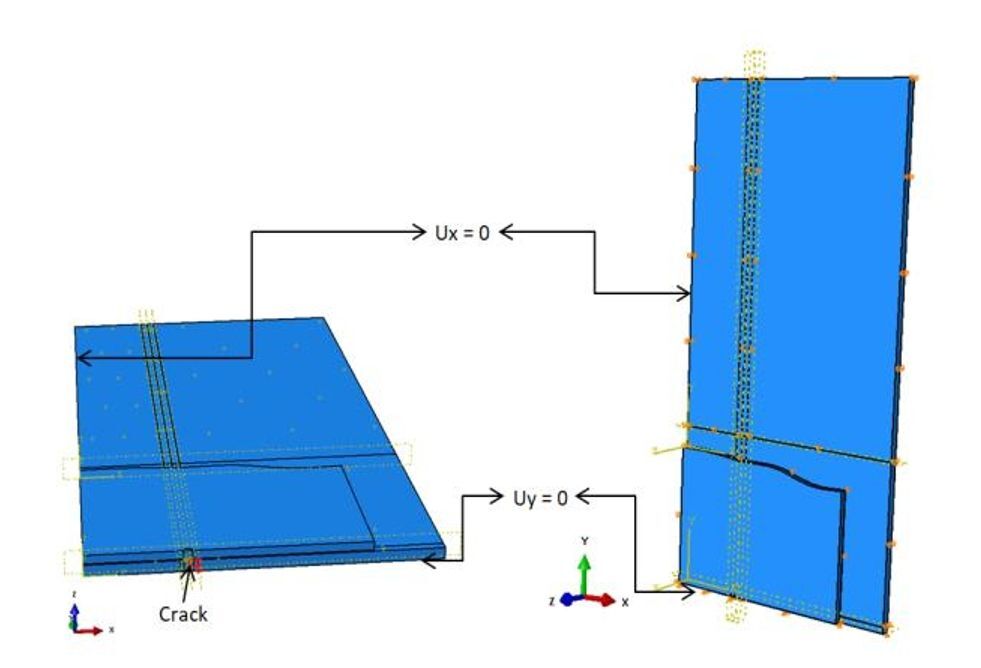 This study focuses on the analysis of a reinforced plate structure, utilizing the principle of symmetry to reduce computational time by examining only half of the model. The plate is characterized by dimensions of W = 125/2 mm in width, H = 250/2 mm in height, and e = 125/2 mm in thickness. An initial crack, with a total length of 2a = 36mm, is located at the center along the longer dimension of the plate. The adhesive layer applied to the structure has a thickness of ea = 0.2 mm, while the patch thickness is er = 1.5 mm. In-plane coordinates along the x-axis are defined as xi = [0,10,20,30,40,50]mm , with corresponding yi values randomly generated between 10 and 40mm, introducing spatial variability to the analysis. The mechanical properties of both the adhesive and the carbon fiber composite patch are detailed in Tab. 2. To simulate realistic loading conditions, a uniform pressure of 150 MPa is applied across the plate.