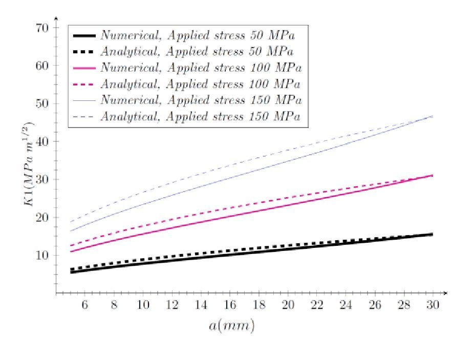 As expected from Linear Elastic Fracture Mechanics (LEFM), increasing the applied stress results in higher (K1) values. The numerical and analytical results show close agreement at lower crack lengths, but at larger lengths, the differences become more noticeable. For an applied stress of 50 MPa, both solutions start at lower (K1) values, with the numerical approach appearing slightly more conservative. Starting from the stress level of 100 MPa, the numerical and analytical curves begin to diverge at about 15 mm in crack length. At 150 MPa, the divergences in result are most heavy, which may demonstrate an ability for a numerical method to capture complexities such as crack-tip plasticity and geometric effects. This agrees with previous fracture mechanics studies, such as those by [35,36], which have established that for complex geometries or boundary conditions, numerical models often give more accurate results. Furthermore, (Kirthan et al, 2014) [37] noted that the rate of crack growth increases with increased levels of stress, as shown by the increasing values of (K1) in this figure. Increase in the applied stress as well as the length of the crack increases the stress amplification at the crack tip, hence the exponential growth of K1, as observed in the literature. Overall, the numerical model seems to be more conservative for shorter crack lengths and may hence be advantageous in safety-critical applications, whereas the analytical method has a tendency to slightly overestimate the value of K1 for longer cracks. This means that the numerical methods are closer to reality in tackling real-life complexities, particularly regarding the crack-tip stress concentration of components under intense stress.