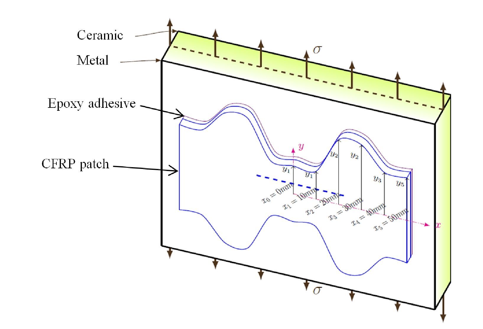 Functionally Graded Materials are advanced composites that exhibit a gradual transition in material properties, enhancing mechanical performance by integrating the strengths of different materials. In this study, the plate consists of ceramic and metal layers. The ceramic layer on the top provides exceptional wear and thermal resistance, while the metallic base offers ductility and damage tolerance. Fig. 8 illustrates the use of Carbon Fiber-Reinforced Polymer (CFRP) patches to repair or reinforce the plate in areas prone to cracking. CFRP is commonly employed in structural repairs due to its high strength-to-weight ratio, corrosion resistance, and ease of application. The non-uniform patch profile emphasizes the importance of optimizing patch geometry to reduce stress concentrations, thereby improving the fatigue life of the repaired component. A set of measurement points (x0 ) to (x5 ) is distributed along the x-axis, spaced at 10 mm and 50 mm intervals, highlighting regions of interest for stress analysis.