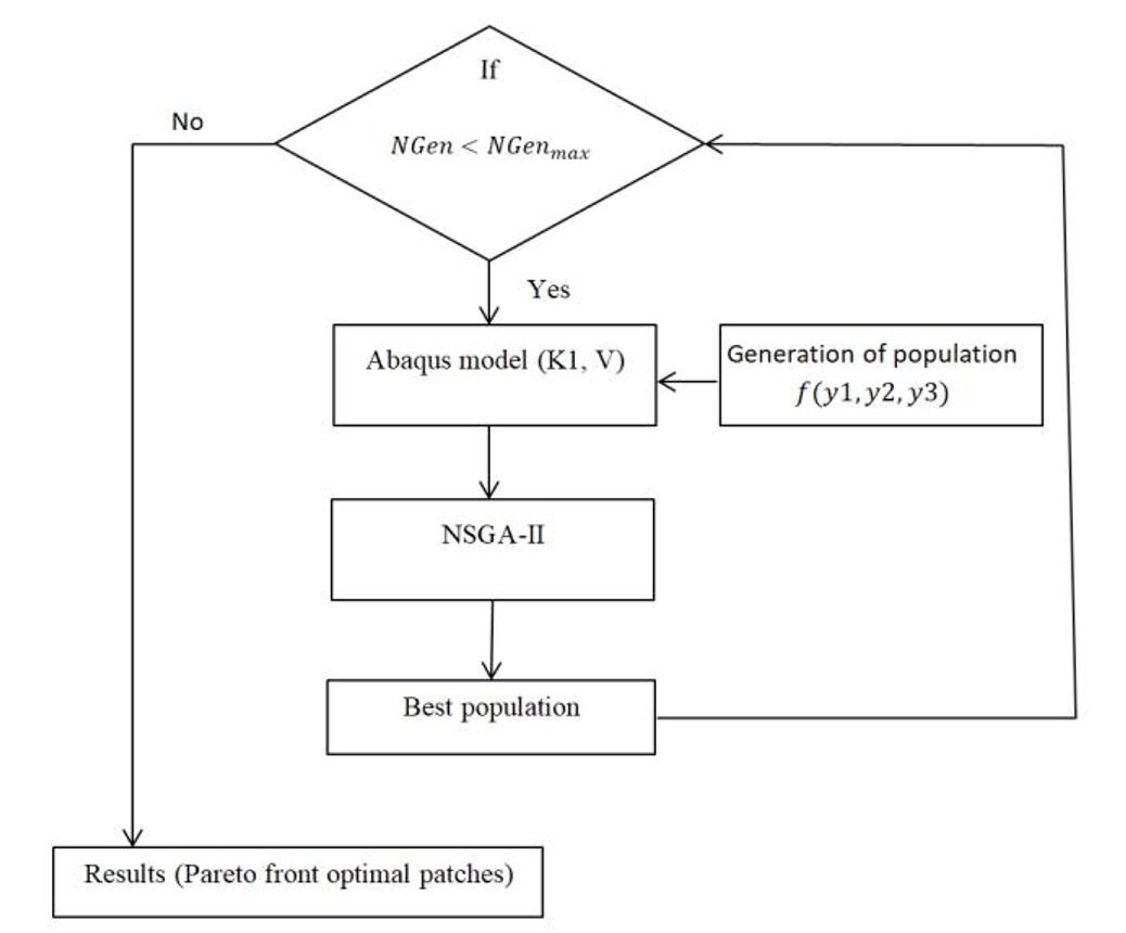 Fig. 9 Flowchart of the optimization process using NSGA-II to obtain the optimal patch geometries from Pareto front. This is necessary when dealing with multi-objective problems such as minimization of K1 and maximization of V for better performance of the patch. It does this by first generating a population of possible solutions with parameters; these parameters will most likely be geometric dimensions or material properties of the patch. The population is allowed to evolve through generations, with Abaqus modeling and evaluating each solution for K1 and V in orde to measure its performance. In each iteration, NSGA-II evaluates the population, ranking solutions based on non-dominance. The best population from each generation is selected and refined through this evolutionary approach. The loop continues as long as the number of generations (NGen) is less than the maximum allowed generations (NGenmax). When the maximum number of generations is reached or the algorithm converges, the process yields the Pareto front a set of non-dominated, optimal solutions. This front represents the best trade-offs between conflicting objectives, such as minimizing stress while maintaining patch volume, providing insight into the most effective patch geometries. The NSGA-II (Non-dominated Sorting Genetic Algorithm II) method is a multi-objective optimization algorithm widely used to solve complex problems where multiple, often conflicting objectives need to be optimized simultaneously. The algorithm starts by generating an initial population Pt, then creates a population Qt by applying genetic operators such as selection, crossover, and mutation. These two populations are merged to form Rt, a combined population. Then, Rt is sorted into several fronts F1, F2,.., using a Pareto dominance-based sorting: front F1 contains the nondominated solutions, followed by the successive fronts F2, F3, etc. Within each front, a measure called crowding distance is used to assess the diversity of solutions. Individuals are prioritized to ensure a good distribution of solutions on the Pareto front. The new population Pt+1 is then formed by selecting individuals from the successive fronts until the maximum population size is reached, giving priority to those who contribute to the diversity if necessary (Fig. 10). These steps are repeated until the stopping criterion is met [38].