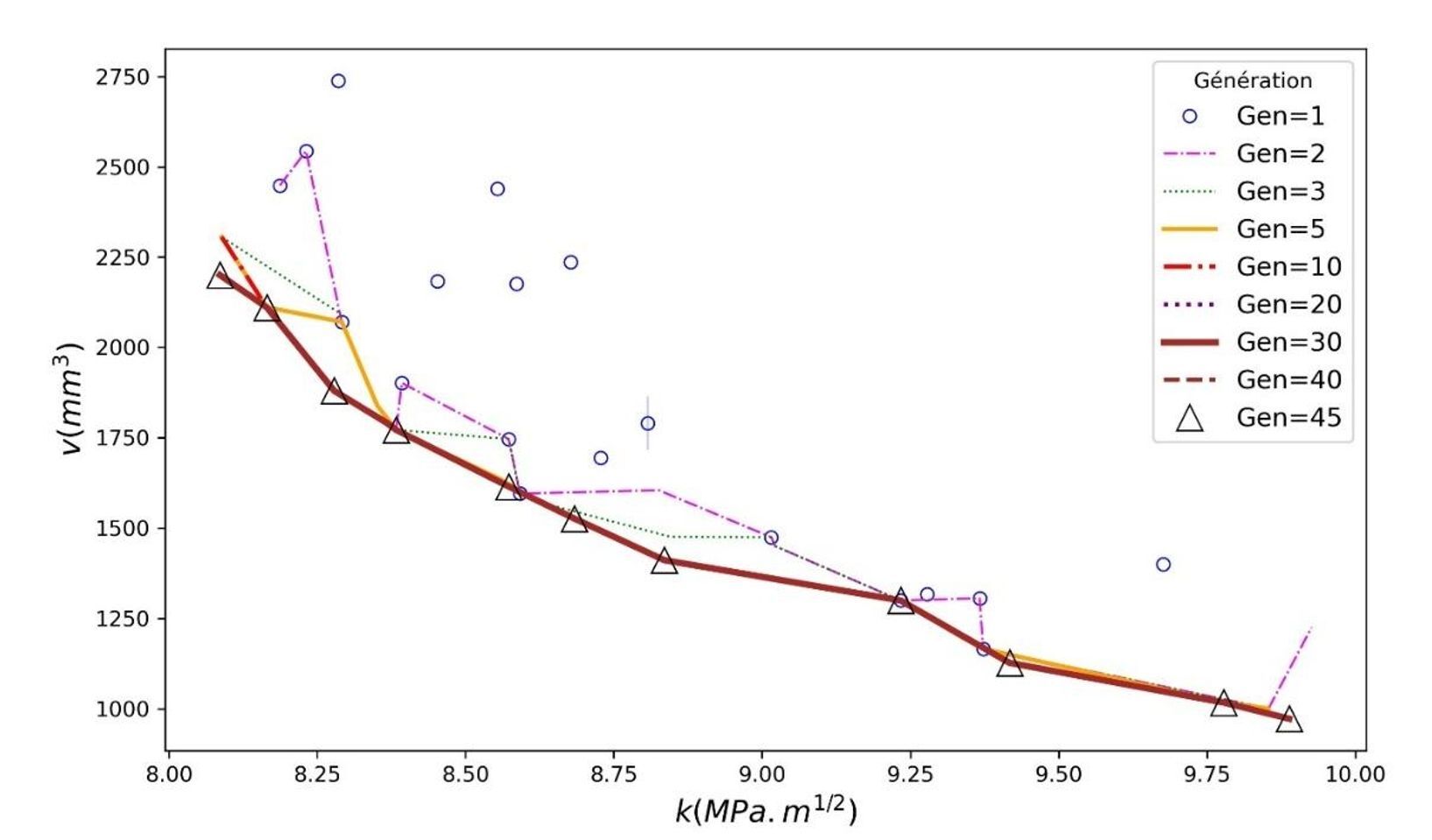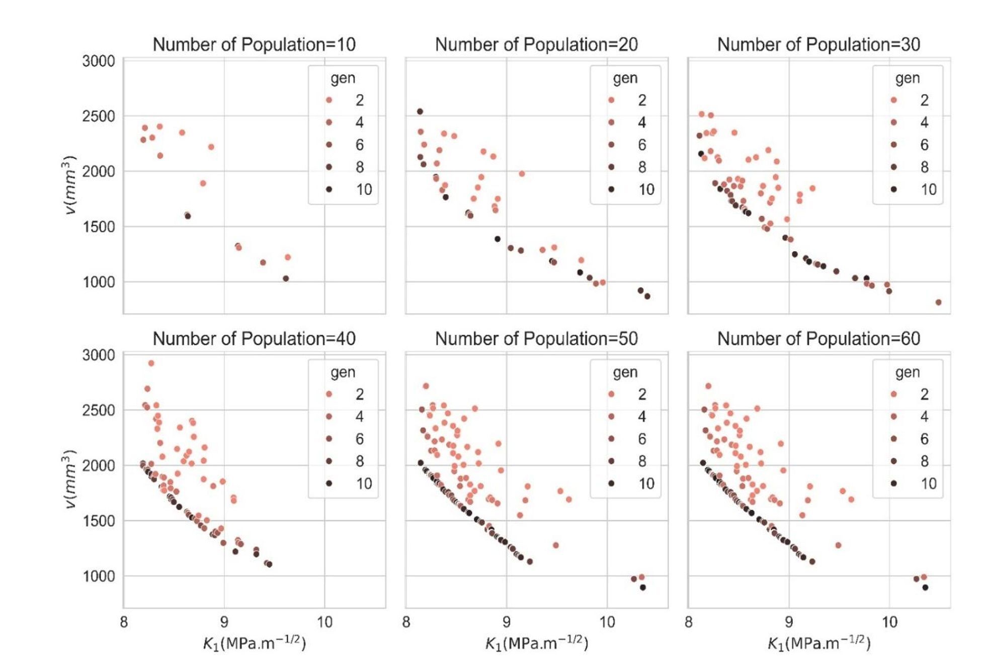 The evolution of the Pareto front using NSGA-II optimization for varying population sizes (10, 20, 30, 40, 50, and 60) demonstrates the trade-off between volume V and K1. As illustrated in Fig. 12, each plot captures the spread of solutions over 10 generations, with distinct colors representing the progression across generations.