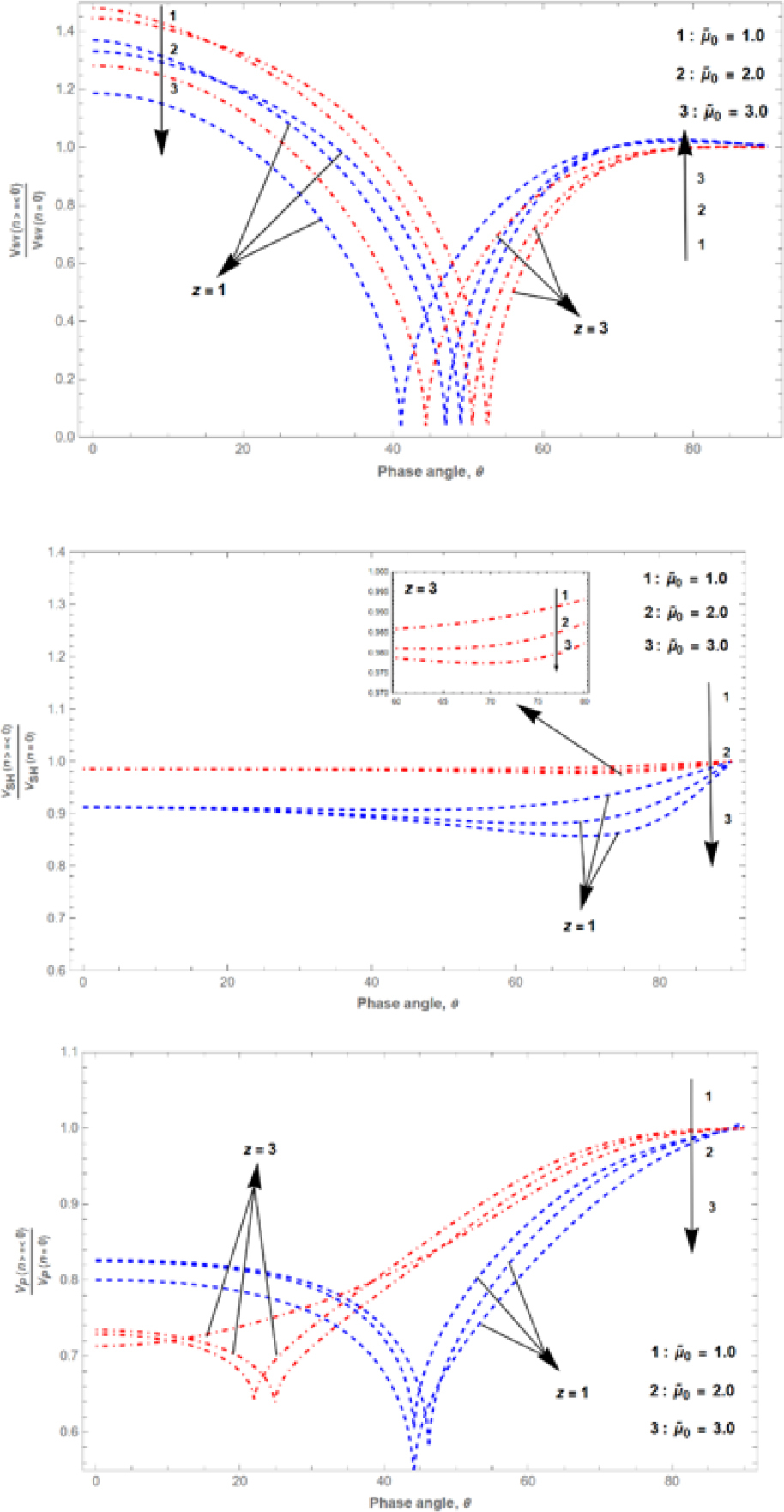 The current investigation deals with two sets of graphs, i.e., Fig. 2 and Fig. 3. In Fig. 2, the study has been done for all three quasiwaves, i.e., VSV-waves, VSH-waves, and VP-waves. The main intention is to find the influence of the inhomogeneity parameter n (which varies as (n =-0.2, 0.0, 0.2) on the phase velocity of the (VSV, VSH, VP) waves. Let us consider the first figure of Fig. 2, i.e., the VSV-wave, in which it can be observed that the velocity decreases from 0 degrees to nearly 60-degree and then suddenly goes up and meets at the phase velocity 1.0. In the figure, it is clearly visible that the depth parameter has a significant effect on the phase velocity; the influence in the case of z = 1 m quite greater than that of z = 3 m. Again, on considering the VSH-wave, it has been found that on increasing the phase angle, the phase velocity seems constant up to 76-degree and then suddenly jerks up and down and meets at 1.0. Here, we can also say that the influence of the inhomogeneity parameter decreases with increasing depth. Finally, the last figure in Fig. 2 has been plotted for the VP-wave for both the depth parameters z = 1 m and z = 3 m. The study shows the increasing nature of the phase velocity for the increasing inhomogeneity parameters. The effects are visible to the naked eye, and for all three velocities, one can conclude that by increasing the inhomogeneity parameter n, the phase velocity decreases at a particular phase angle.