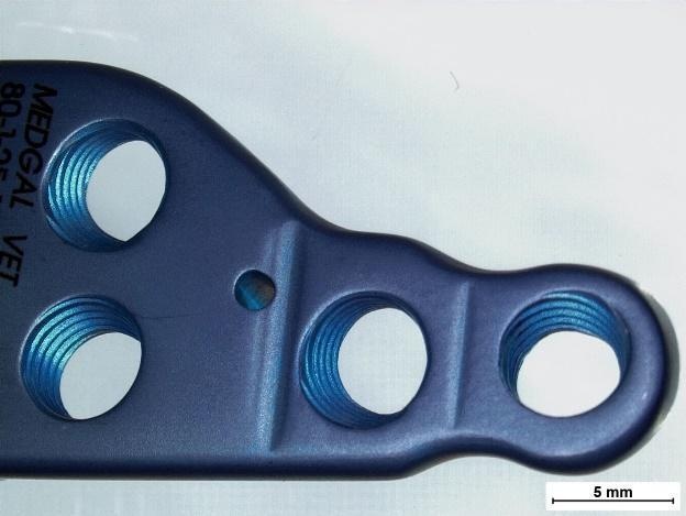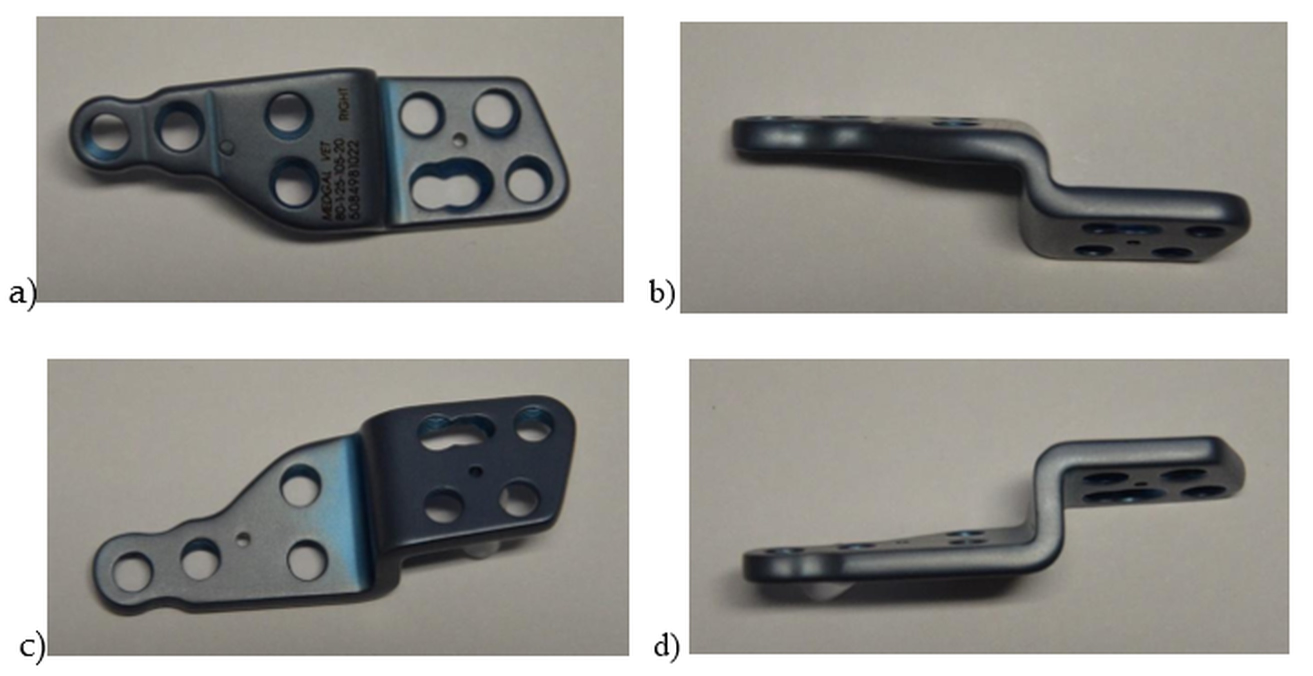 The presented research results are part of the authors' ongoing work on small animal orthopedics, mainly the design of implants for the treatment of fractures of dogs. This issue is a complex process due to various factors, such as the age of the dog, the location of the fracture, the nature of the fracture or the type of surgical technique. In addition to factors of biological nature, the success of fracture treatment is also affected by interactions in the implant-organism system, where there are both, interactions of chemical nature, such as the environment of body fluids, and interactions of mechanical nature, which are the result of the dog's activity. Poor implant manufacturing quality can cause corrosion damage, causing the implant to break, or, via degradation products, lead to osteolysis, as a result of which the implant may become loose.