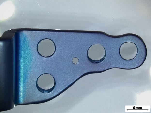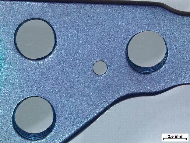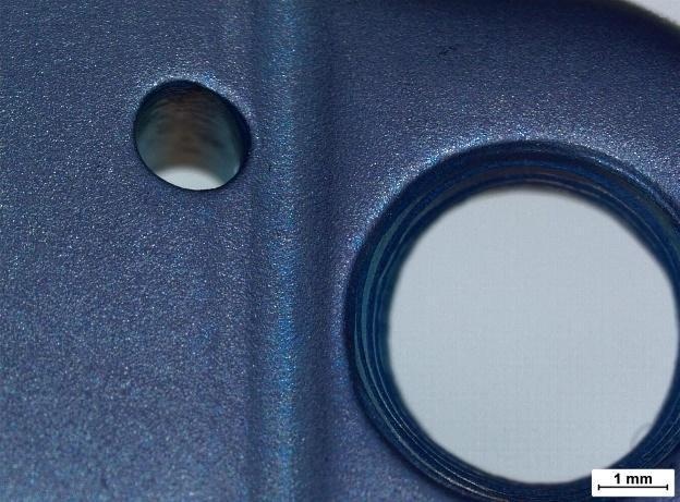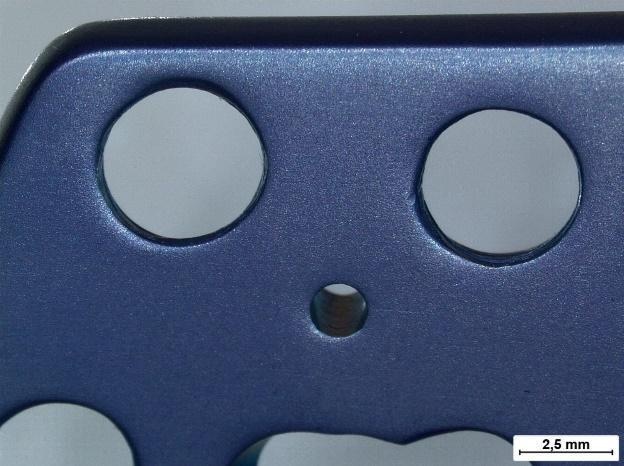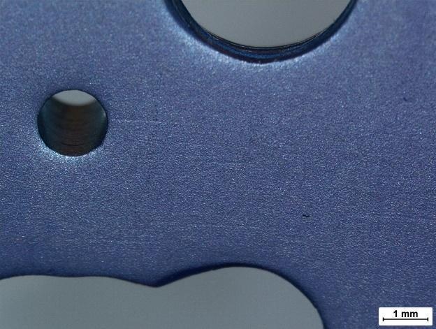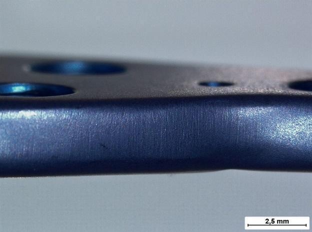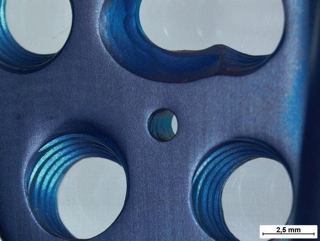 The surface of the implants is characterized by a heterogeneous, matte, blue color (Figure 2 a), the intensity of which changes slightly within the zones subjected to permanent deformation during the shaping of its structural form (Figure 2 b). The variation in color was also influenced by the heterogeneous topography of the implants, created during vibration processing - Figure 2 c, d, e. Moreover, scratches remaining after grinding are visible on the surface of the implants (Figure 2 e, f). They occur mainly on the side surfaces of the implants (Figure 2 f). No unwanted machining residues were observed in the threaded holes and screw sockets. These surfaces are also characterized by a blue color (Figure 2 g, h).