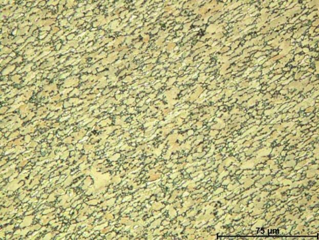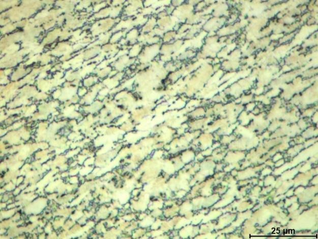 Based on the observations made, the correct structure of the material from which the plate was made was observed. Observations showed the existence of a two-phase structure α + β - Figure 6. It was characterized by a homogeneous microstructure consisting of equiaxed grains of the α phase and the β phase located at the grain boundary of the α phase.