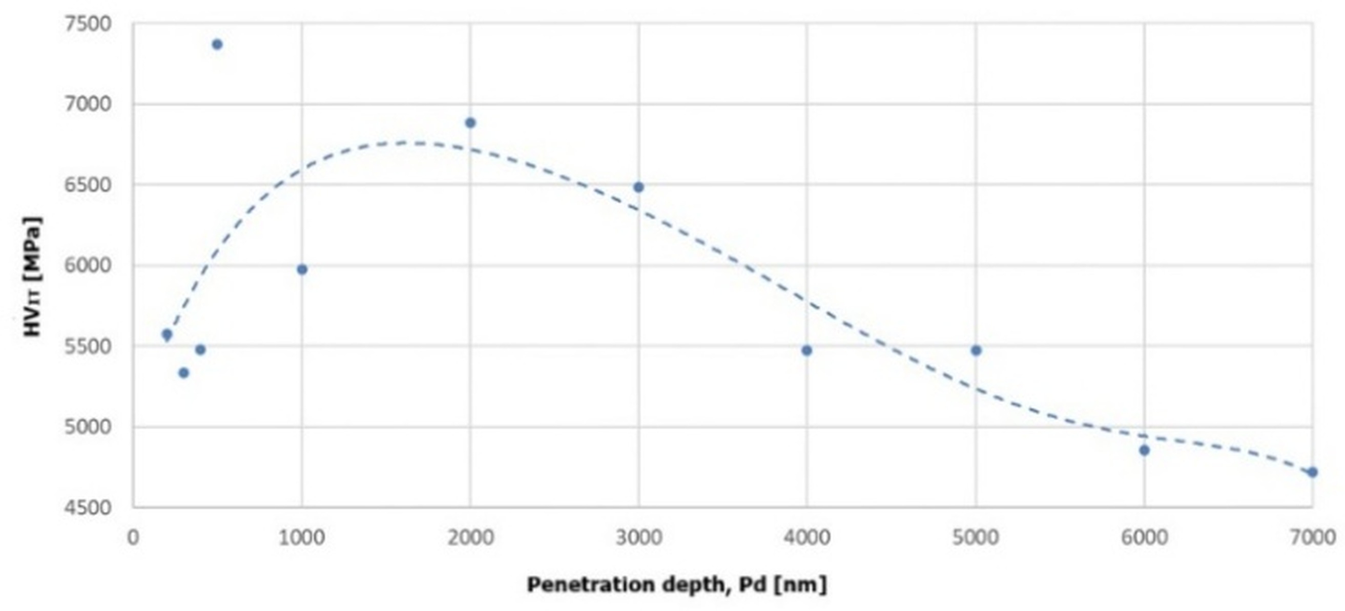 The hardness profile of the coatings on the surface of the tested implant was carried out on an open platform equipped with a Micro-Combi-Tester from CSM Instruments using a Vickers indenter using the Oliver&Pharr method. The aim of the test was to determine the instrumental hardness as a function of the penetration depth. The speed of loading and unloading was 3000 nm/min, and the time of holding the sample under maximum pressure was 5 s. The value of the indenter load was the resulting one. Microhardness measurement was carried out at the following penetrator depth values: 200 nm, 300 nm, 400 nm, 500 nm, 1000 nm, 2000 nm, 3000 nm, 4000 nm, 5000 nm, 6000 nm, 7000 nm.