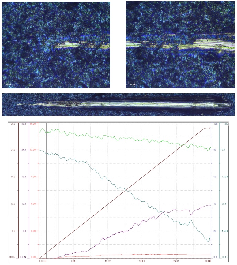The analyzed coating was characterized by good adhesion to the substrate. Based on the measurements performed, it was found that the coating was chipped at a value of Lc2 = 1.27 ± 0.05 N, and a complete break in its continuity was observed at a value of Lc3 = 3.46 ± 0.1 N. Based on the macroscopic assessment of the scratch, discontinuous perforation of the coating was found. Examples of sample surface scratches and the curves recorded during the tests are shown in Figure 9.