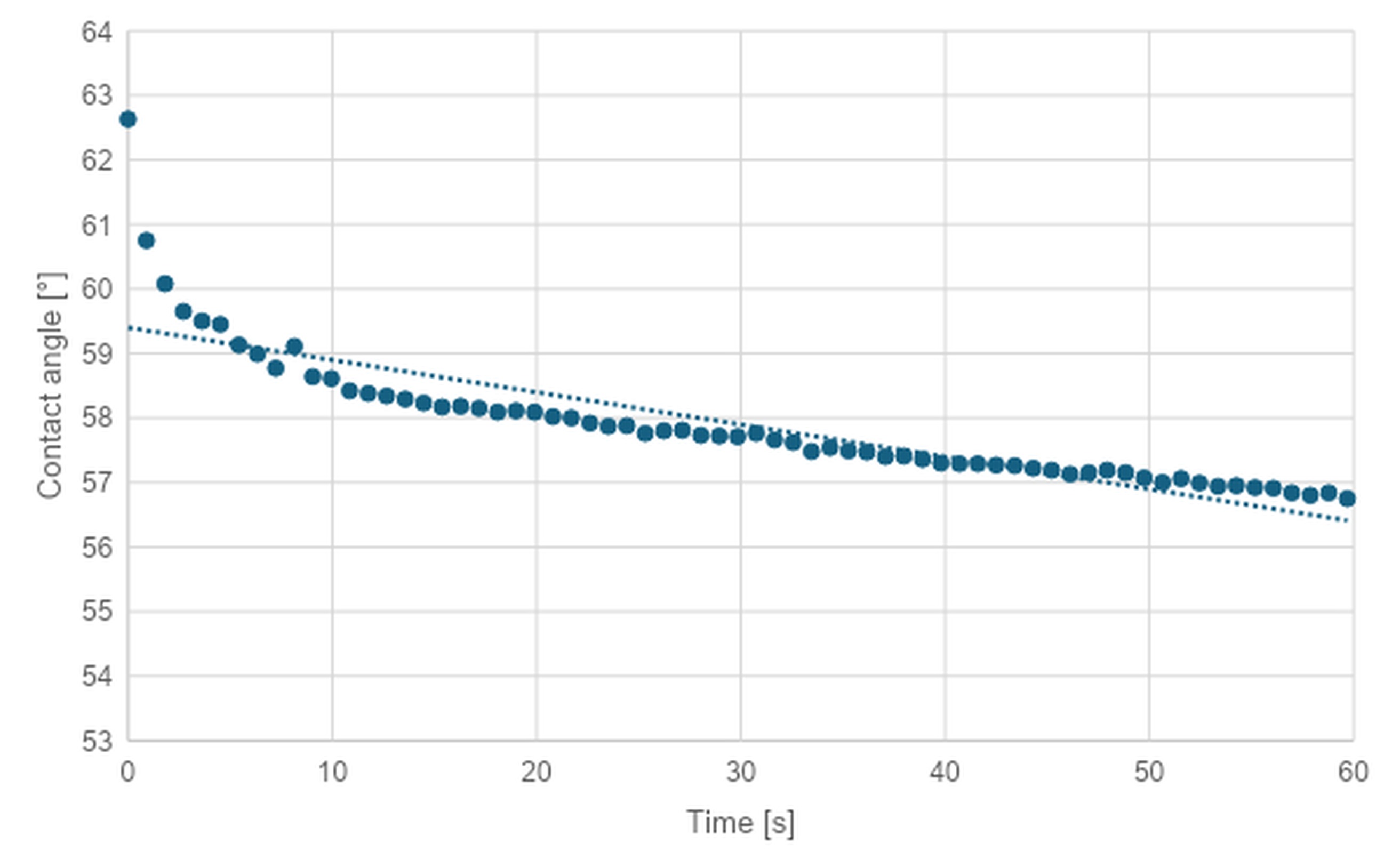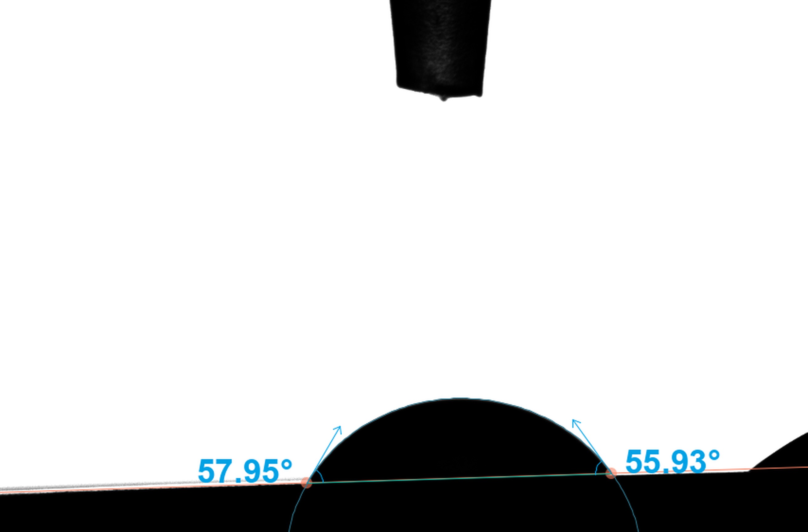 The value of the contact angle Θ of the tested surfaces was in the range of 56.4±58.8°. The average value of the contact angle was Θ = 57.5±2.4°. The obtained results demonstrate the hydrophilic nature of the surface. Figure 11 shows an example droplet. Figure 12 shows the water contact angle as a function of time.