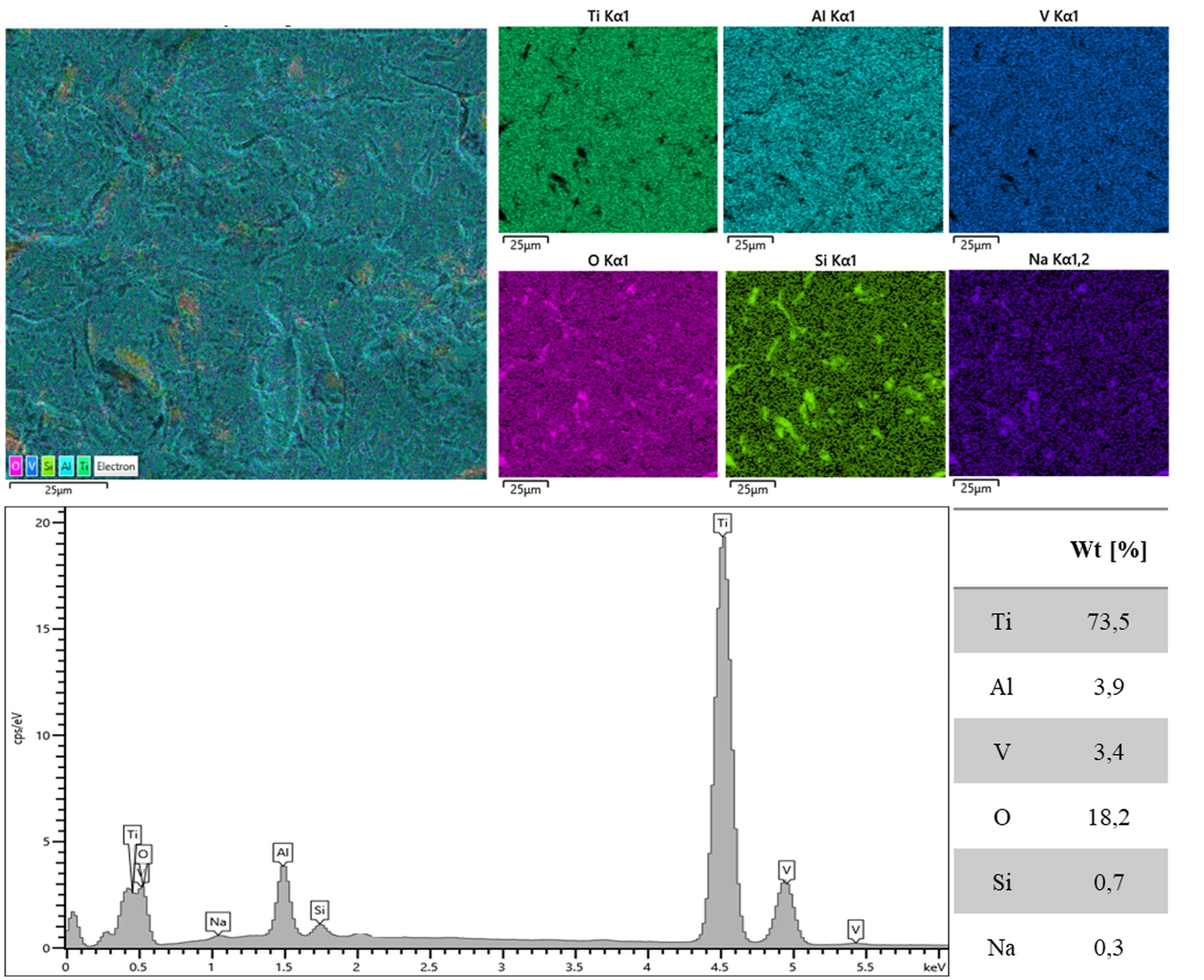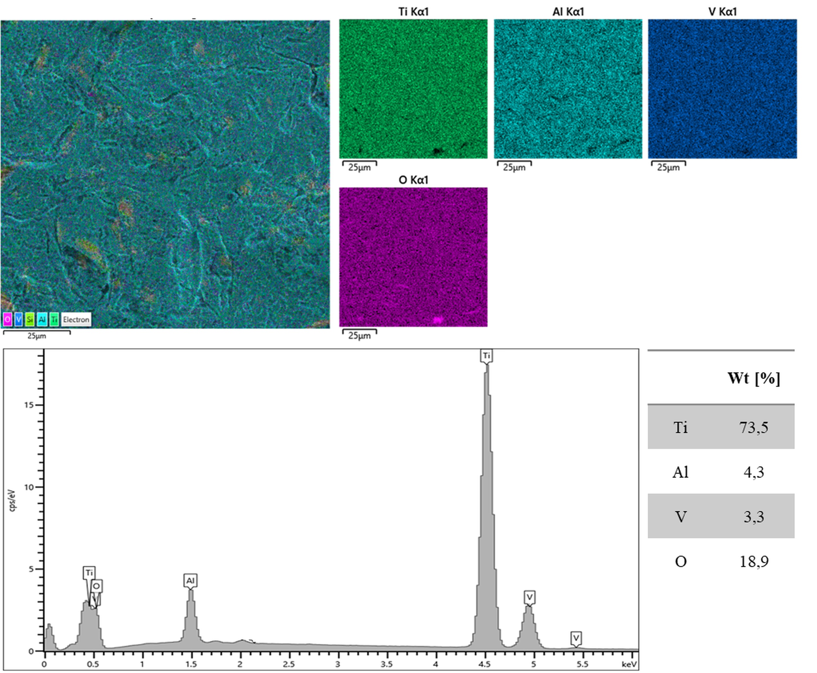 Analysis of the chemical composition of the implants' surface layer showed that they consist mainly of Ti, O, Al and V. Moreover, in the lower surface layer of the implants (adjacent to the bone), the presence of Si and Na, which are remnants of vibration processing, was found. The surface image, overview spectrum and element distribution of the upper and lower surface layers are shown in Figures 13 and 14, respectively.