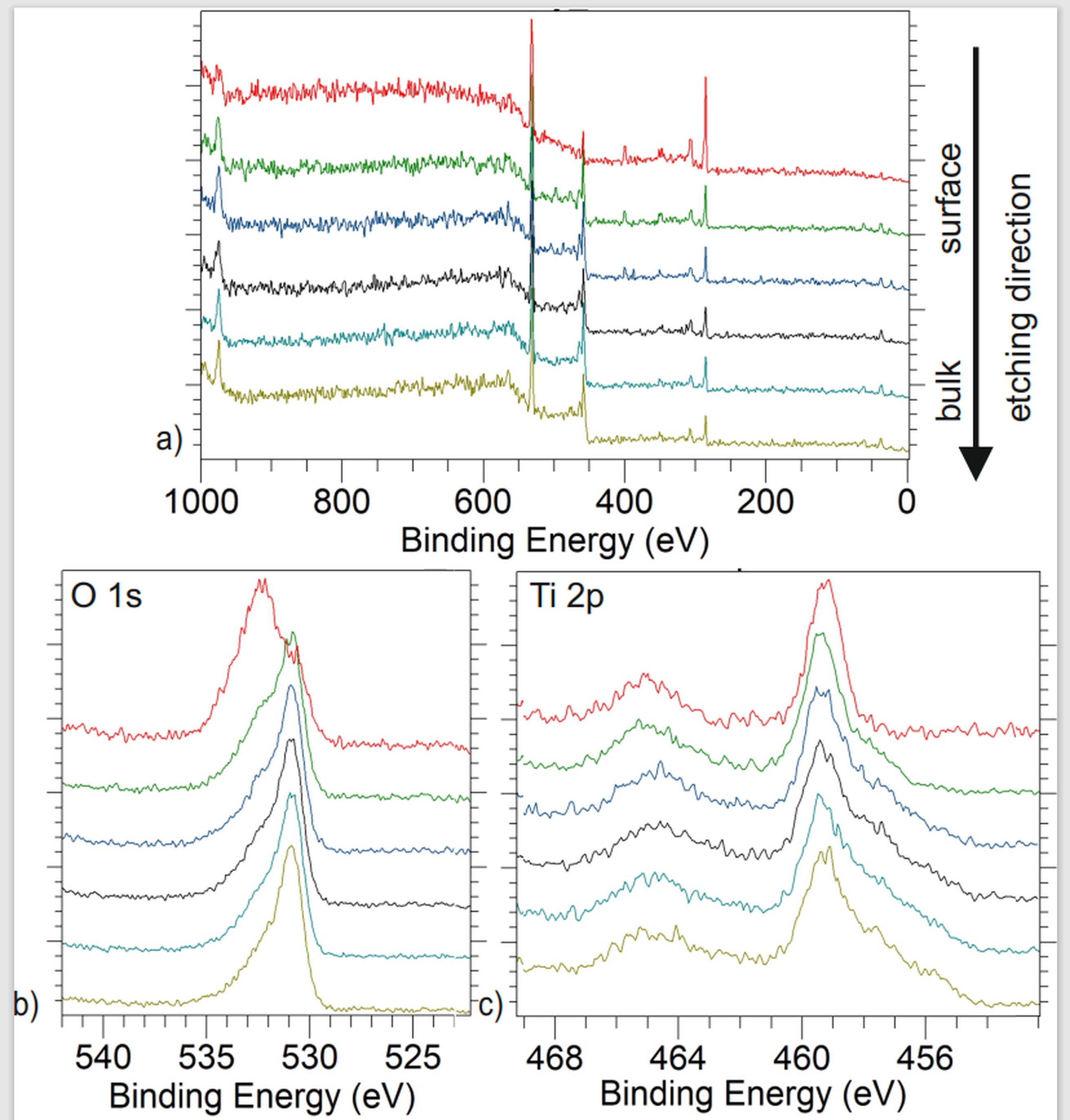 Figure 15 b) and c) presents the magnification of the regions of interest, i.e. o 1s and Ti 2p respectively. In O 1s spectrum, one can observe the significant decrease of the high binding energy branch and shift of the peak’s center towards lower binding energies along etching procedure. In case of Ti 2p core level the single distinct component at ~458.5 eV (with its spin orbit splitting counterpart at ~465 eV) can be clearly observed for surface scan. The energy position points clearly the Ti(IV) oxide with near-stoichiometric composition [19]. For in-depth signals, however, one can notice additional contributions appearing below ~459 eV indicating sub – stoichiometric composition or other Ti oxidation states.
