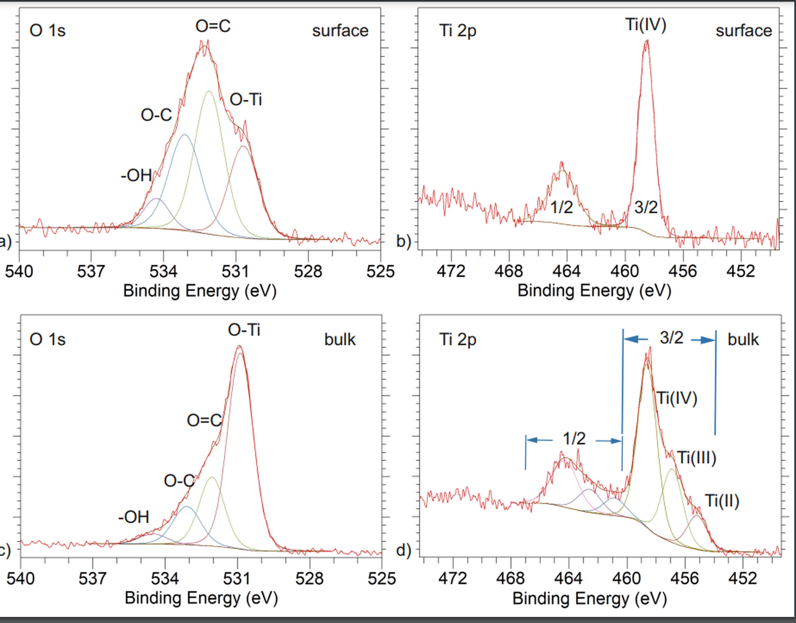 For precise description of the oxide composition these two regions (i.e. O 1s and Ti 2p) underwent detailed decomposition. Figure 16 a) and b) presents decomposition results for the spectra acquired for the initial (non-etched) surface for o 1s and Ti 2p regions respectively. Next, panels c) and d) in Figure 16 shows the decomposition results of the bulk – related core levels after last ion etching procedure. One can see that the O 1s region (surface one) can be decomposed with four components representing (from lowest binding energy) O-Ti configuration, O=C, O-C/O-C-O and -OH configurations (14). The bulk signal (Figure 16 c)) is represented with the same components, however with significant decrease of the carbonaceous and -OH related species. This is consistent with decrease of the carbon signal along etching procedure (see Figure 15 a)). The main component (O-Ti), even if relatively narrow (i.e. ~1.35 eV full width at half maximum) does not however allow on titanium oxide composition description. Therefore Ti 2p analysis was also done. For the surface related Ti 2p region (Figure 16 b)) presents distinct Ti 2p 3/2 signal with its spin-orbit splitting ½ counterpart. The ½ to 3/2 energy distance as well as the 3/2 energy position points near-to stoichiometric Ti (IV) oxide with no suboxides (the FWHM is below 1.18 eV). After the etching process, for the bulk region (Figure 16 d)) two additional components appears at ~456.8 eV and at ~455.2 eV. The energy positions indicates that the most probable configurations are Ti (III) and Ti (II) oxides respectively [19]. However, the dominating one (>80 % of the overall signal) is still Ti (IV) oxide with main component at ~458.7 eV [2, 3] which is important, no Ti0 state was detected.