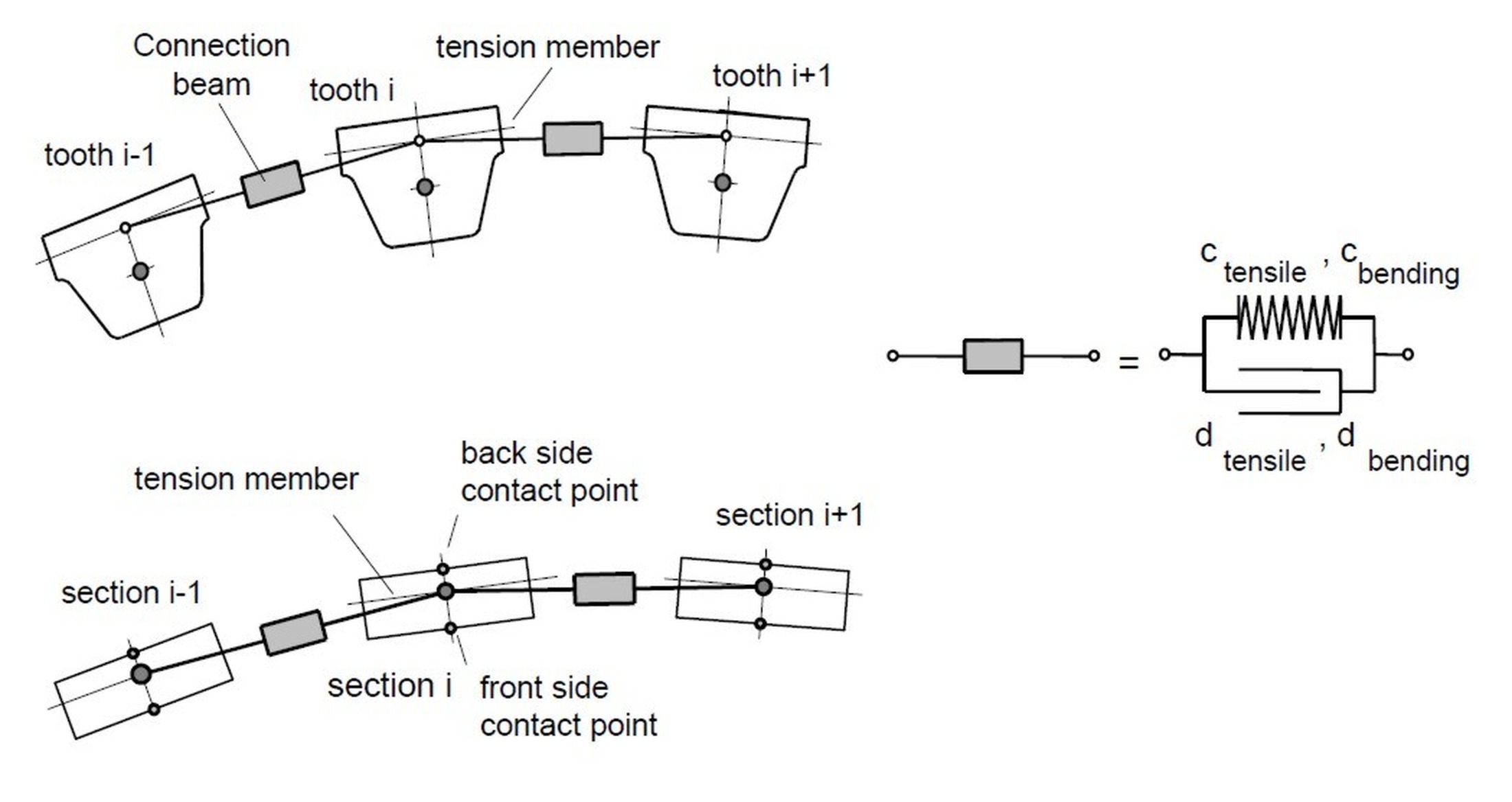 Fig. 1. Mechanical model of belt made from TPU with steel-cord tensile members: a) timing belt, b) flat belt [3]