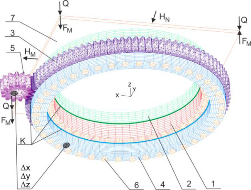 The Fig. 3 shows: 1 - the bearing inner ring, 3 - outer ring, 2 - the upper and 4 - lower support structure, 6 - heads of the mounting bolts, and 7 - plate which have been discretized by eight-nodal finite elements type 3D-Solid [27–28], whereas 5 - the pinion and 3 - the toothed rim were discretized by twelve-nodal finite elements.