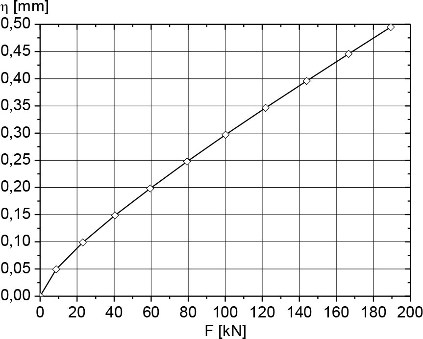 Material characteristics shall be determined on the basis of contact zone characteristics. Characteristics of the contact zone is defined as dependence the raceway deflection η caused by a contact rolling section force F.