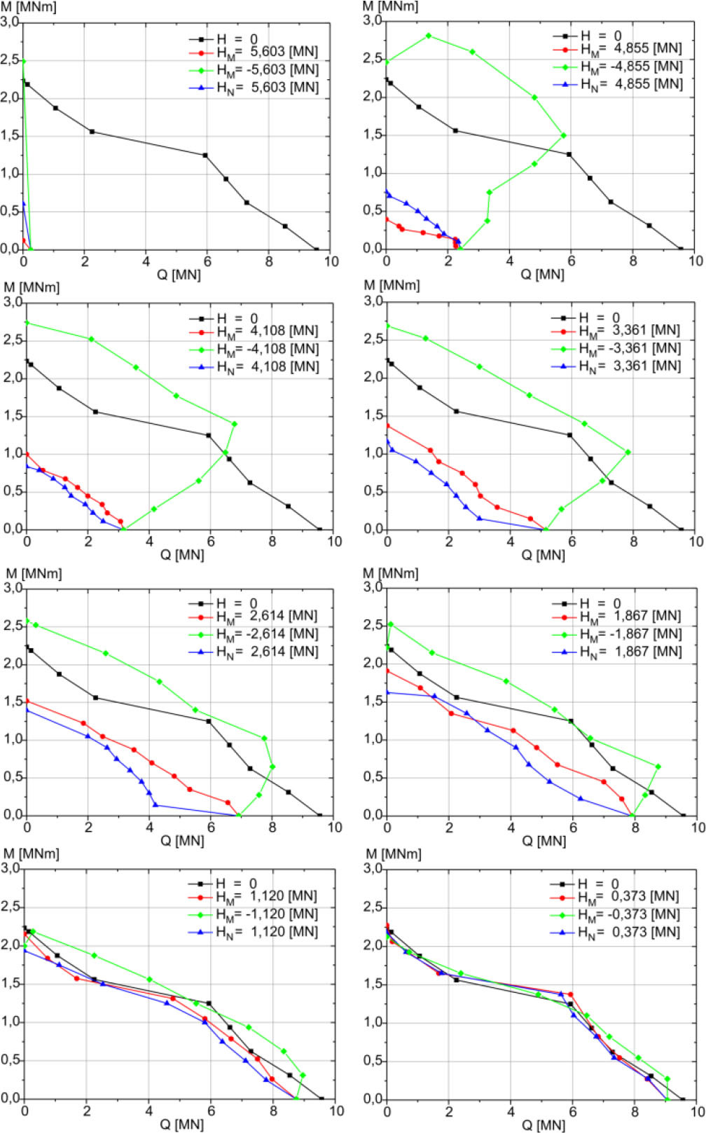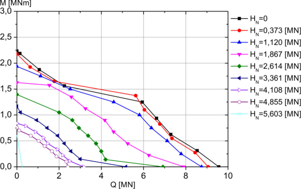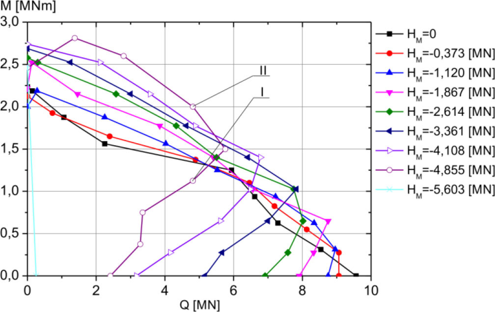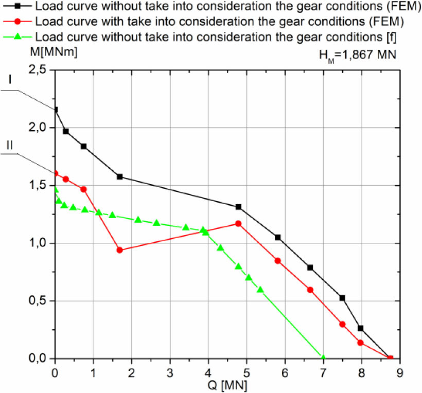 A full static limiting load curves of the slewing bearing have been presented in Figures A1–A4 [11] (Appendix A) but without taking into consideration the gear conditions. These charts show the influence of radial forces (specifically directed) on courses of bearing static carrying capacity curves (Q, M). A significant loss of static carrying capacity is caused by the radial forces HN directed orthogonally and the radial forces HM directed positively (Fig. A1). On the basis of these results (Q, M), for given radial forces HN (Fig. A4) and HM (positively – Fig. A2 and negatively - Fig. A3 directed), using the model presented here, comparative calculation were performed. It was concluded that plane created during the main system of forces is the plane of pinion symmetry the radial forces HM (directed negatively) and HN does not cause a change of the bearing static carrying capacity. A loss of the static carrying capacity occurs when the radial force HM is directed positively. This is especially noticeable when the radial force HM is about 15% of the maximum allowable axial force Qmax (M=0, HM=0, HN=0). In considered case the bearing radial force is HM=1,120 [MN]. This load was implemented in the FEM slewing bearing model (Fig. 3) with taken into account gear condition. The static carrying capacity curve was determined for this load. In Fig. 6 there are shown courses of the static carrying capacity load curves of the slewing bearing with and without taken into consideration gear condition.