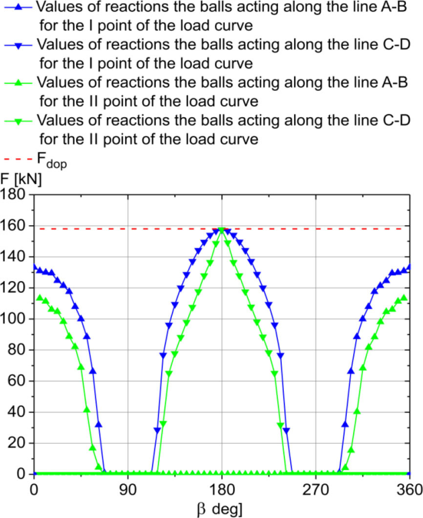 This study was based on the criterion of the permissible plastic deformation in the contact zone which, in accordance with the assumptions [34] should not exceed 0,0002dk. Hence, the maximum force value, which is allowed for a single ball-raceway contact zone was calculated in accordance with equation 2 [34] and amount Fdop = 158 kN.