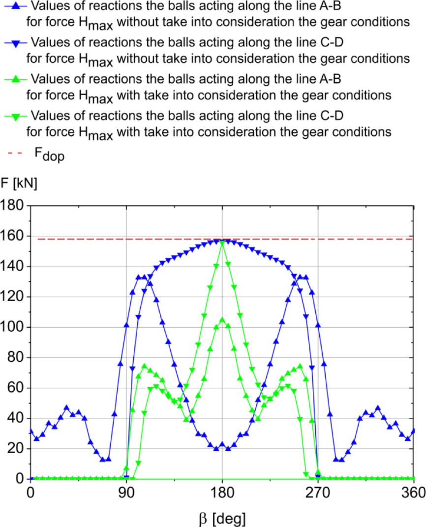 Comparison of distribution of the forces acting on balls of the single-row ball slewing bearing for the maximum radial force with taken into consideration (Hmax=5,977 [MN]) and without(Hmax=3,3 MN) the gear condition, β- angular coordinate