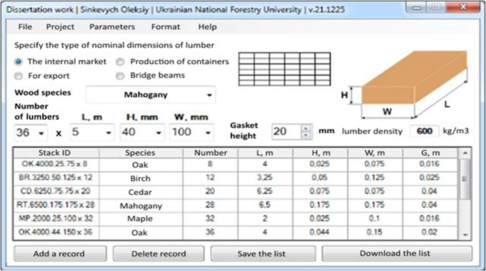 Upon selecting all the requisite parameters and clicking the “Add a record” button, a new stack identifier is appended to the database. Its ID is constructed in the following manner: the initial two letters denote the wood species code, such as “BR” for birch, “CD” for cedar, “RT” for mahogany, “MP” for maple, “OK” for oak, and so forth. The subsequent numbers correspond to the length, height, and width of an individual material, along with their quantities. This comprehensive information is crucial for the automated design of the specified stack.