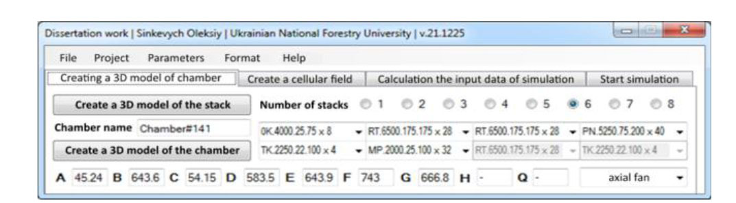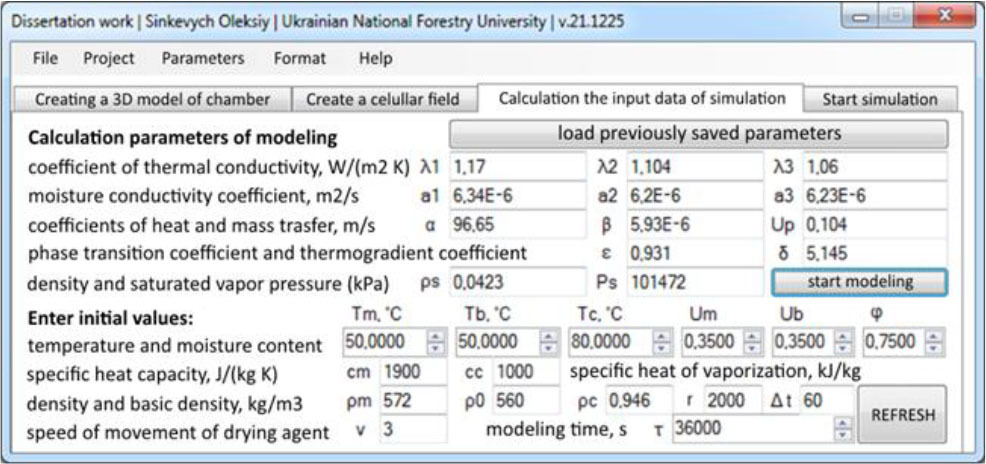 On this tab, the user enters the initial values of some parameters, in particular: temperature and moisture content of lumber; temperature and relative humidity of the drying agent; specific heat capacity; density and basic density of the material; specific heat of vaporization; simulation time and time step. At the same time, the rest of the parameters, most of which are represented by different coefficients, will be determined automatically. Having all the parameters for the simulation, user can start its execution using the same tab.