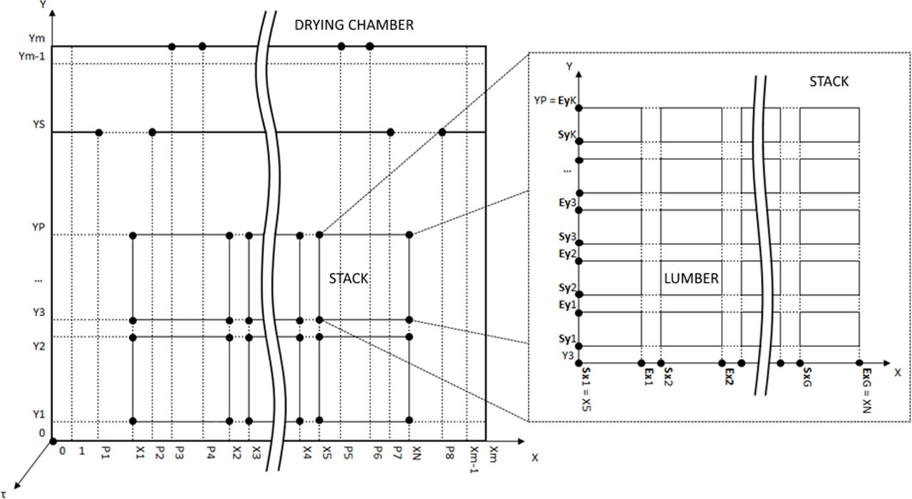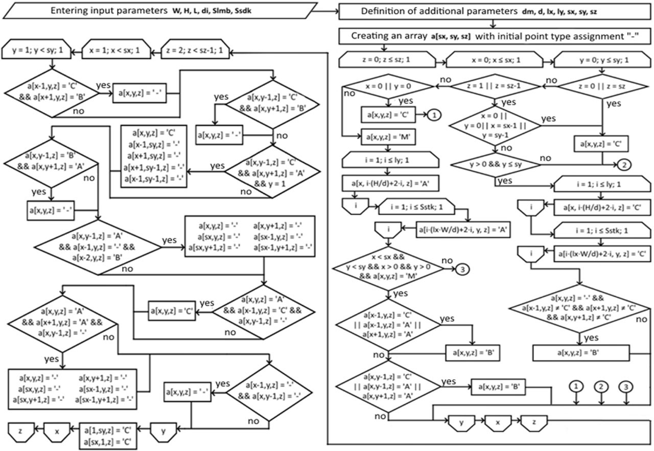 To create a cellular-automata field, the initial step involves creating a specific graphic scheme (refer to Fig. 5), that illustrating the systematic process of transforming the 3D model of stacks. Similarly, the process of converting the 3D model of the drying chamber will take place.