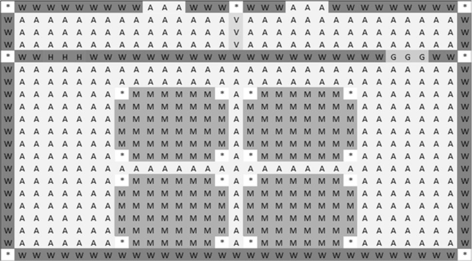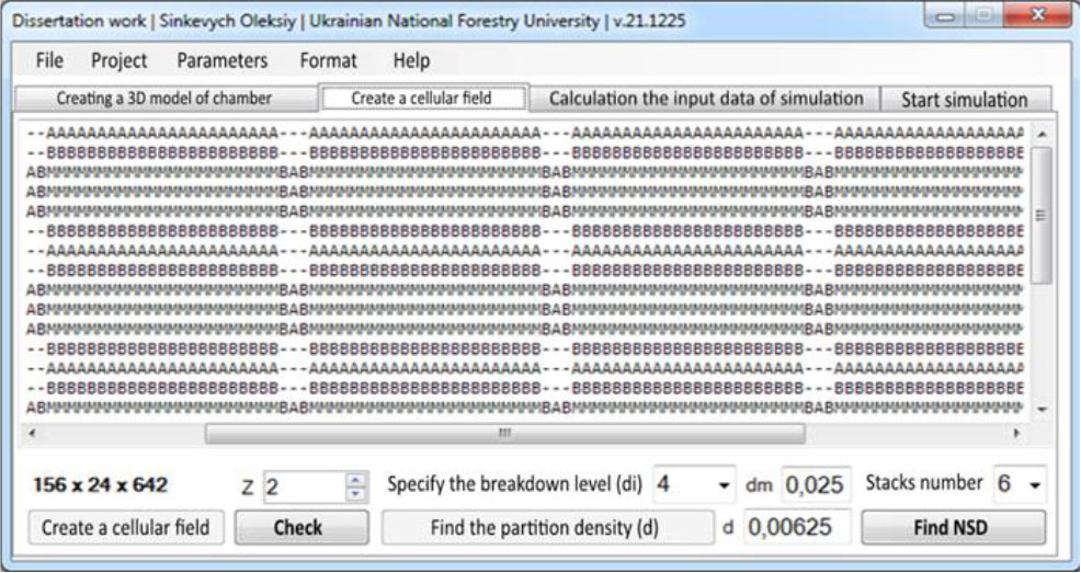 When considering the cellular automata field within the arrangement of the stacks, the cells can have different types, with the main ones being: “A” for the drying agent, “B” for the border of lumber, and “M” for their internal drying zone. To create a cellular automata field by using the software, it is necessary to open the second tab of the main program window (refer to Fig. 7). On this tab, users can inspect the structure of this cellular automata field. To do so, they need to specify one of the coordinates and click the “Check” button. The two-dimensional view of this field will be display in the window below.