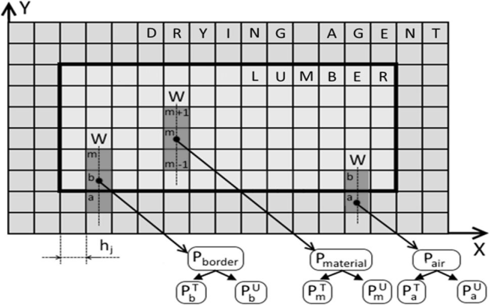 where: ρs – density of saturated vapor, Up – equilibrium moisture content, ρ0 – base density of materials, am(x), am(y) – moisture diffusion coefficients of materials, ρa – density of the drying agent, v – velocity of the drying agent flow, αm(x), αm(y) – heat transfer coefficients. In this case, the coordinates of the boundaries of this zone should be within the following limits: