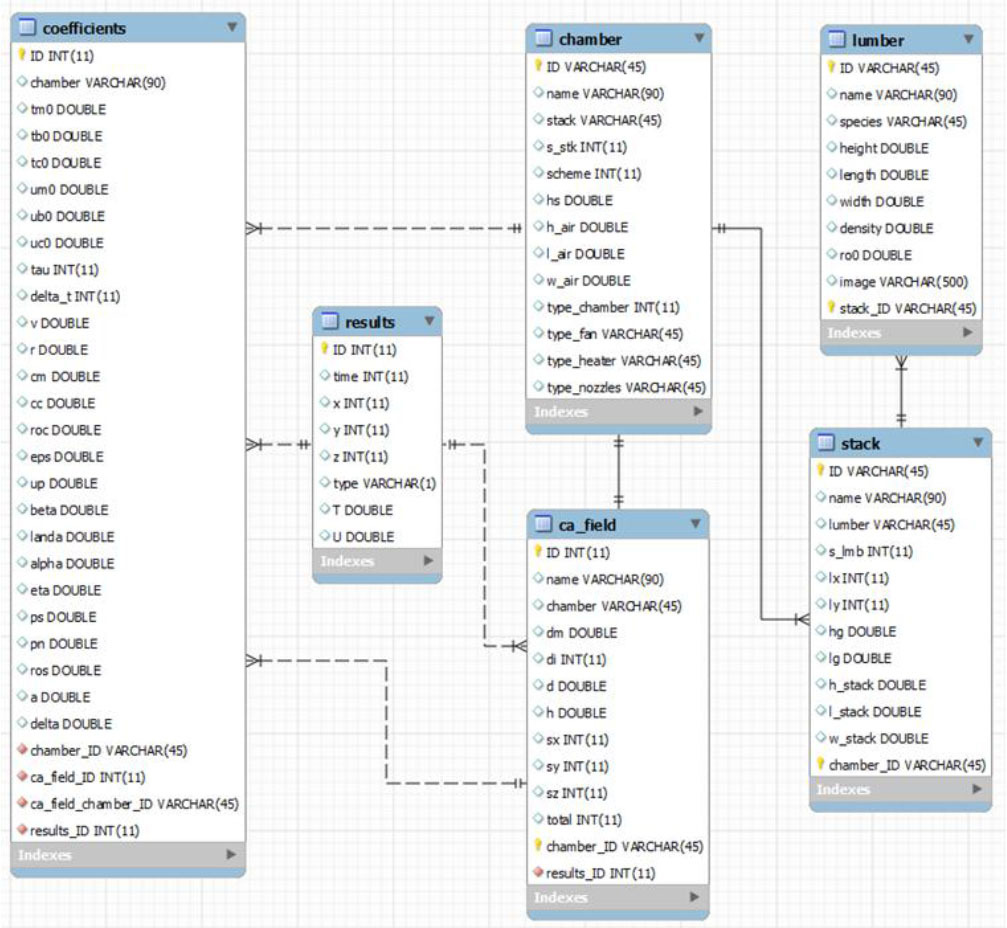 To carry out modeling, it is absolutely necessary to have a database in which the results will be stored. To create it, it was decided to use the MySQL Workbench Community Edition environment. The created database is named “dissertation” and consists of several interconnected tables, namely: “lumber”, “stack”, “chamber”, “ca_field”, “coefficients” and “results”. The “lumber” table contains a unique lumber code that is generated automatically and has the following structure: “ХХ.LL.HH.WW”, where “ХХ” is the type of wood (birch - “BR”, cedar - “CD”, Beech - “RT”, maple - “MP”, oak - “OK”, pine - “PN”, teak - “TK” and other), “LL” - length, “HH” - height, “WW” - width of lumber in mm. Also in this table there is information about the density of the material. The “stack” table contains a unique stack code that is generated automatically and has the following structure: “XX x LL”, where “XX” is the number of lumber in the stack, and “LL” is the unique lumber code. Also, this table contains data on the number of lumber in the stack, their location, and information on the size and number of spacers between rows of lumber. The “chamber” table contains the unique code of the drying chamber, which is generated automatically and has the following structure: “ХХ→SS”, where “ХХ” is the number of stacks in the drying chamber, and “SS” is the unique code of the stack. Also, this table contains information about the number of stacks in the chamber and the scheme of their arrangement along it. The “ca_field” table contains information about the cell autofield, including the number and sizes of cells. The “coefficients” table contains information about all modeling parameters, both initial, which are constant, and current, which change with the passage of model time. The last table “results” contains information about the results of the simulation and is the largest among all of them. To display the entities, attributes and relationships between them, an Entity-Relationship (ER) diagram (refer to Fig. 12) was created. It provides an opportunity to better understand how the data will interact with each other in the developed software.