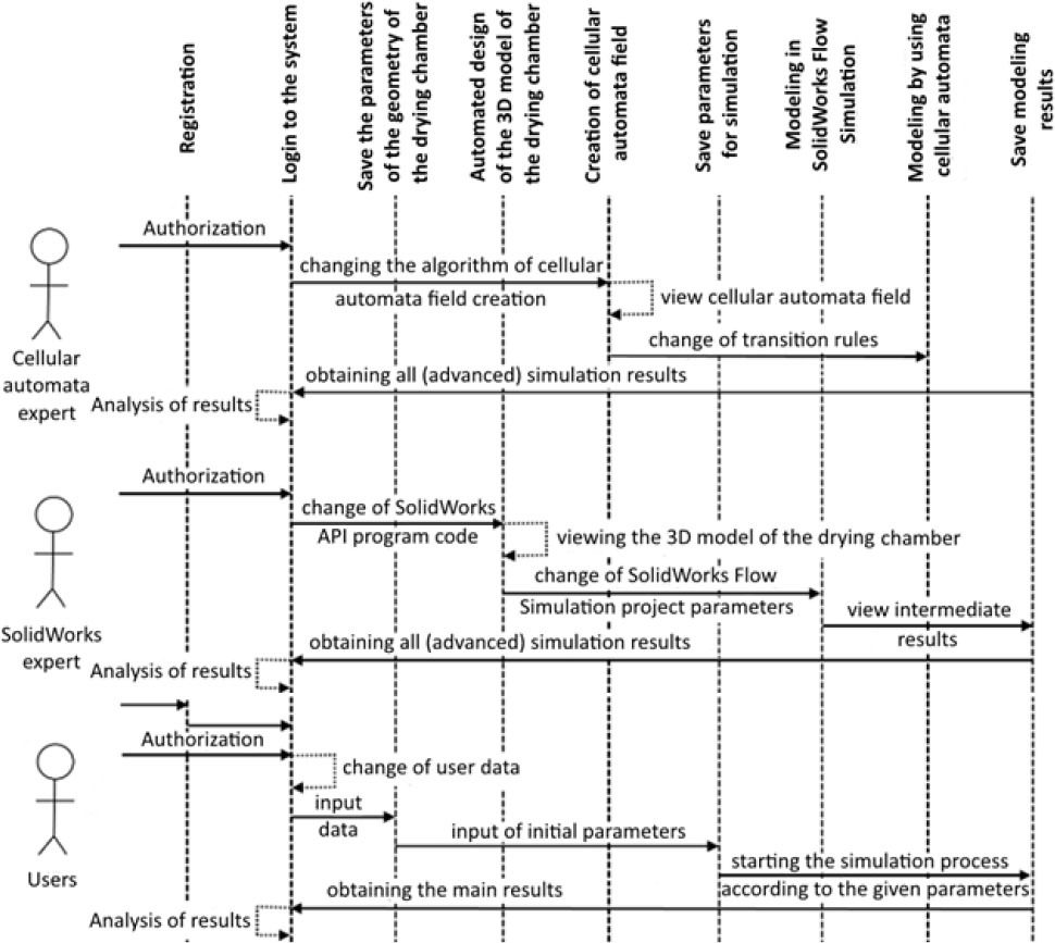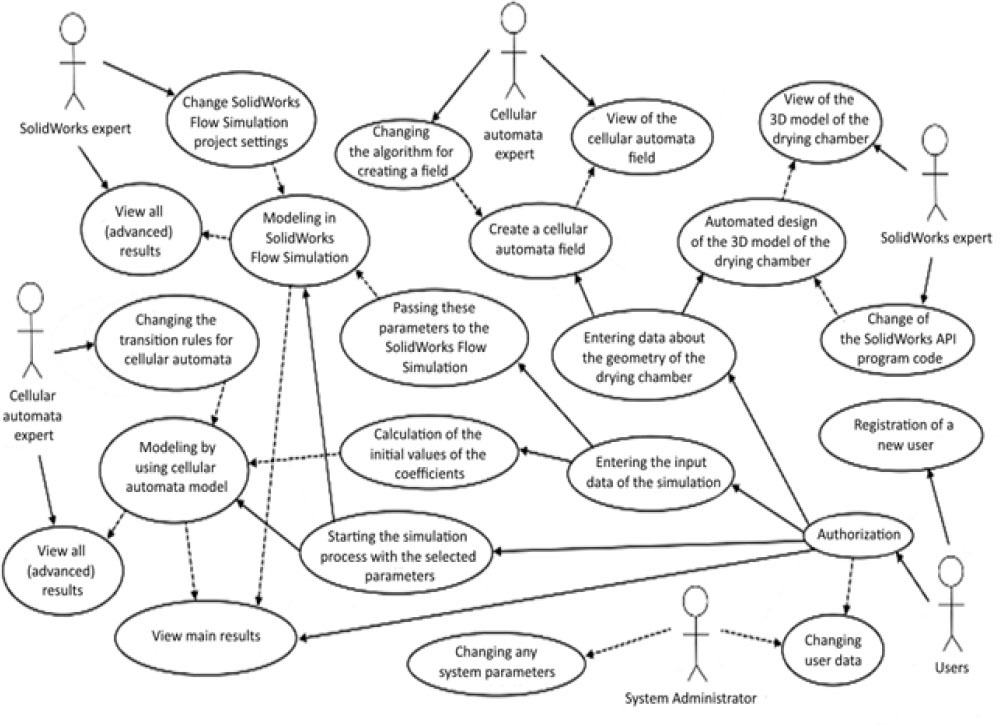 To visualize the functionality of the system from the perspective of users and other system agents, a UML use case diagram was created (refer to Fig. 13). It is used to describe how a system interacts with its environment, including users and various processes. By its structure, this diagram has actors that interact with the system. These actors are divided into 4 types, namely “Users”, “SolidWorks experts”, “Cellular automata experts” and “System administrators”. Each of them has its own access rights and certain usage options. Each of these use cases represents a specific scenario that the system supports and can implement. At the same time, each scenario details the sequence of actions and interaction between actors and the system.