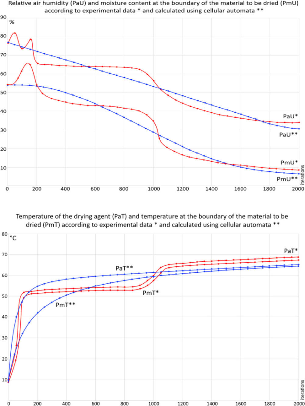 The validation of the developed cellular automata model was carried out by comparing the obtained results with experimental data, with the average MAPE value not exceeding 13%. This level of error is acceptable, since the processes of heat and mass transfer during the drying of hygroscopic materials characterized by complexity, multifactoriality, and nonlinearity. This makes modeling with absolute accuracy impossible, even with the most advanced approaches. Under such conditions, an error of 15% considered typical for most models in this field, since achieving perfect accuracy is extremely resource-intensive. At the same time, the proposed cellular automata model demonstrates accuracy comparable to existing models, but characterized by higher computational speed, which makes it practically valuable for real-world applications.