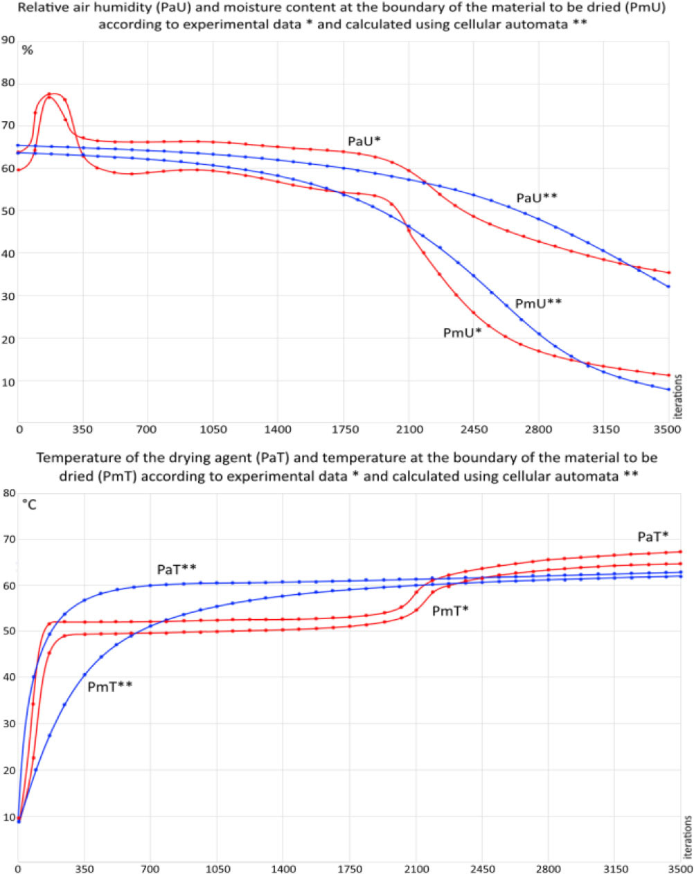 As a result of the simulation [19], graphical dependences of the main parameters of the hygroscopic material to be dried and the drying agent over time were obtained (refer to Fig. 16 and 17). The main parameters include: the average relative humidity of the drying agent ( PaU ), the average temperature of the drying agent (PaT ), the average moisture content of the hygroscopic material being dried in the stacks (PmU ) and its average temperature PmT .