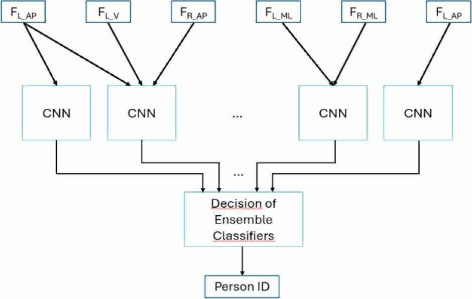 Literature concerning machine learning has repeatedly shown that ensemble learning allows the achievement of better classification results than the utilization of a single classifier [18, 19, 20]. Studies in gait biometrics, including the author’s previous work, similarly indicate that assembling even simple classifiers into ensembles often yields substantial improvements in accuracy and robustness. Many previous studies employing ensemble of classifiers combine models of different types, but such a strategy increases design complexity and computational cost [21]. In contrast, homogeneous ensembles that generate diversity at the data level offer a simpler and more practical solution that preserves implementation uniformity while still benefiting from ensemble effects. The present work aims to address gaps in literature related to the subject of human gait recognition. Its main objective is to present of a method for recognizing individuals based on their manner of walking, using Ground Reaction Forces (GRFs) and a homogenous ensemble of base classifiers where each base classifier is a convolutional neural network.