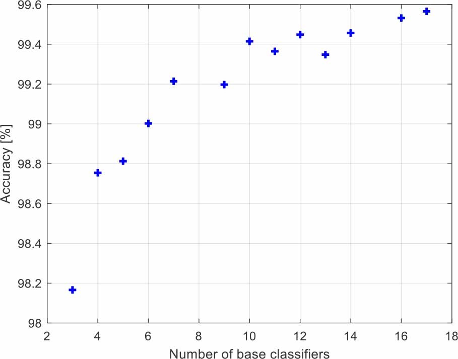 Figure 4 shows the accuracy of the ensemble classifier depending on the base classifiers. When testing more than one combination of base classifiers whose the same number (e.g., EC_3 and EC_9), the average value is marked. This graph shows that accuracy increases with the number of base classifiers used. According to the conclusions of other authors [25], this rise is at first relatively large, but the addition of another base classifier only slightly improves the quality of recognition. In situations where a base classifier of a lower quality than those used thus far, it may even lead to a slight decrease in accuracy. This type of occurrence can be seen in the case of a classifier consisting of 10 base classifiers (EC_6) where the removal of the base classifier ID17 from the set and the addition of classifiers ID10 and ID11 instead(EC_10), despite the rise in the number of base classifiers, resulted in the reduction in classification quality from 99.4147% to 99.3645%.