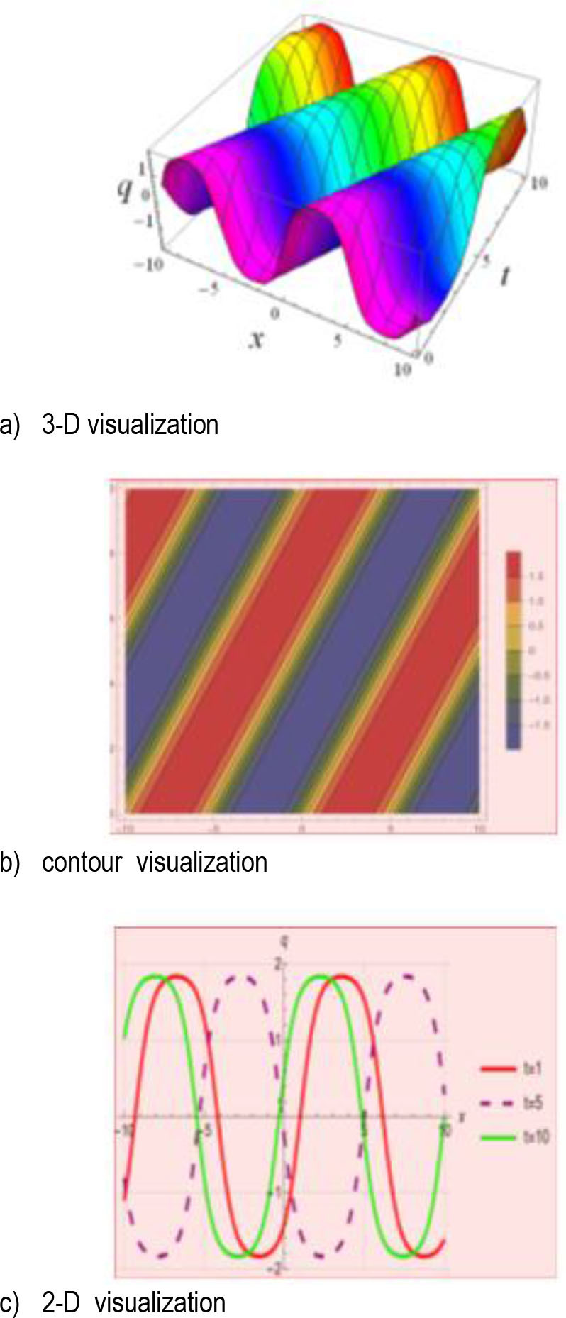 3-D, contour visualization and 2-D propagation of q1,2 for specific values of the parameters are ɛ = 1.2, α = 1.3, δ = 0.5, m = 0.5, c = 2.5