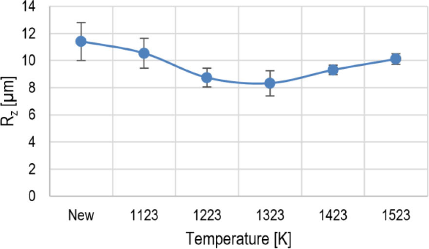 Due to the impact of increasing temperature, the Ra and Rz roughness parameters initially decrease up to a temperature of 1223 K, followed by a slight increase up to 1323 K. The increase in Ra and Rz parameters is impacted by growing thickness of the heat-resistant coating. Therefore, its heat and corrosion resistance deteriorates.