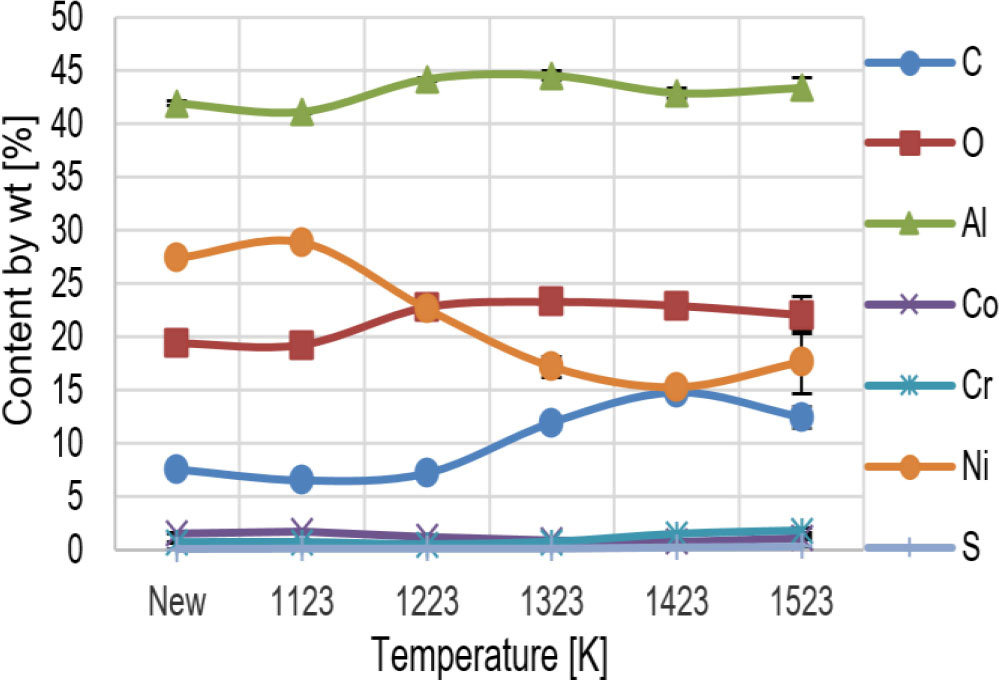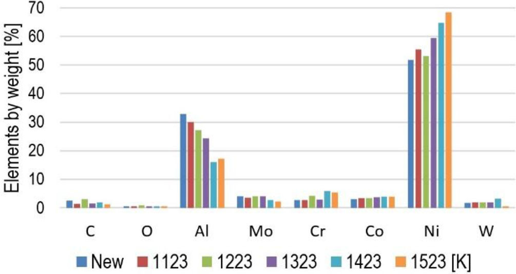 The tests demonstrated that increased blade heating temperature leads to significant changes in the content of individual coating elements, nickel, chromium and aluminium in particular. Cumulative test results for a new blade and blades heated at 1123 K – 1523 K are shown in graphs (Figs. 18 and 19).
