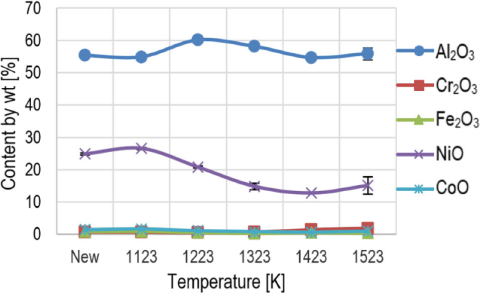 Changes in the content of individual elements also translate to phase changes. They are particularly emphasized if we analyse the impact of temperature on the percentage content share of oxides on the surface of tested blades (Fig. 14). Based on the obtained data, it can be clearly seen that with increasing temperature, the mass oxide share reaches its maximum for a blade heated at 1423 K. In this case, the total oxide share exceeds 50% of the weight content. Furthermore, the recorded changes in oxide share directly translate to changes in their type. The impact of temperature on nickel oxide share changes is particularly noticeable in this case (Fig. 15). NiO content share changes impacted by temperature are primarily associated with the creation of the Al2O3 scale on the surface of the analysed blades.