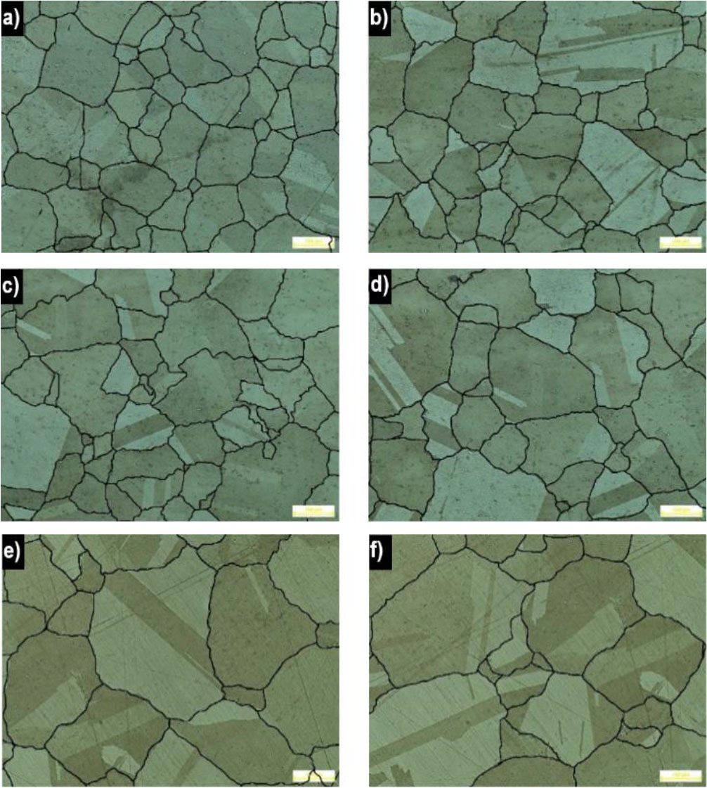 Metallographic microsections were tested under a Nikon MA-200 optical microscope and a Quanta 3D FEG and XL30 LaB6 scanning (SEM) microscopes by Philips. Using NIS Elements AR material microstructure image analysis software, the authors determined the mean size (area) of the alloy grain and reinforcing phase γ’, expressed as the diameter of a circle with an area equal to the surface area of the measured object (Eqdia=sqrt(4*Area/π)). Images depicting alloy grain size by heating temperature can be seen in Fig. 20, and a change in its average size as a heating function can be seen in the graph in Fig. 21.