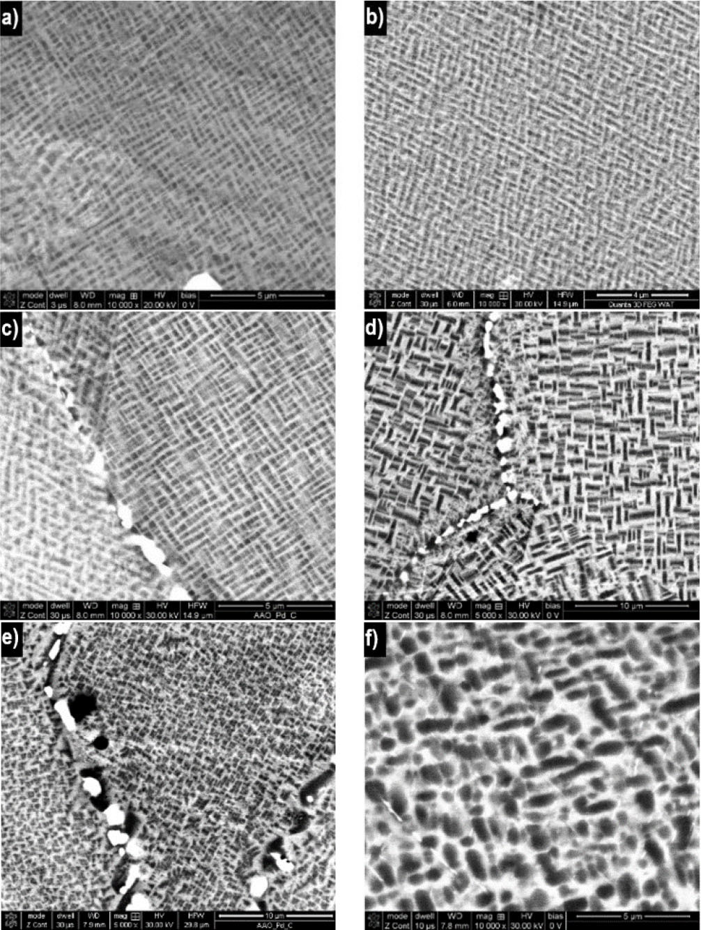 Blade alloy phase γ’ precipitate morphology by heating temperature: a) new; b) 1123 K; c) 1223 K; d) 1323 K; e) 1423 K; f) 1523 K