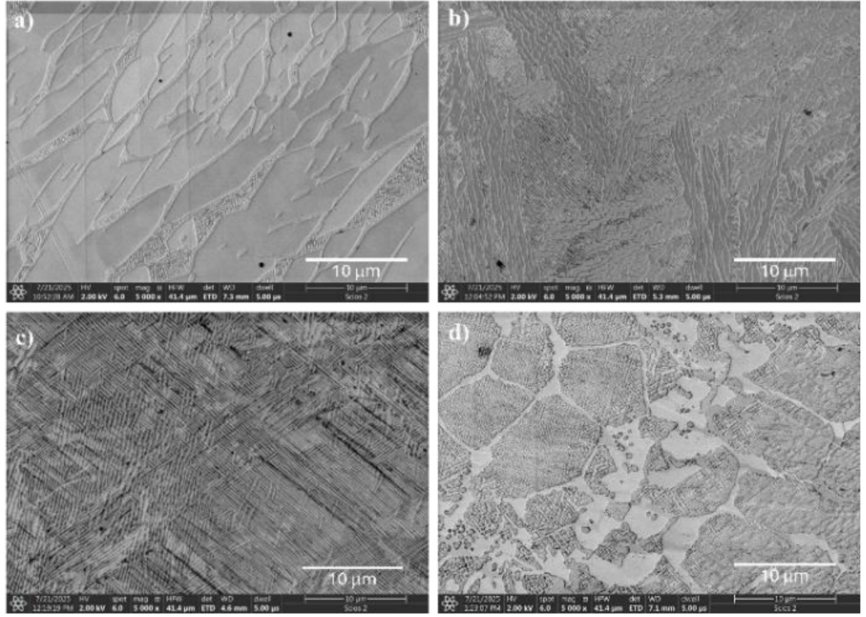 Figure 1 shows representative SEM images of the microstructures of the investigated materials at 5000x magnification. This magnification was chosen due to the extremely fine dispersion of microstructural features, which are smaller than one micrometer. The microstructure of the Ref alloy without titanium (Fig. 1a) is typical for this class of high-entropy alloys with a molar aluminum content below 1. In the case of the reference alloy, the microstructure was previously described in detail by Nowak [38] as lamellar-dendritic. Two highly refined phases can be distinguished, corresponding to A2 and B2 crystal structures, which differ in the concentration of the main alloying elements [39]. The addition of titanium in the amount of 0.05 had virtually no effect on the alloy’s microstructure, except for a further refinement of the individual phases (Fig. 1b). At a titanium content increased to 0.2, the dendritic morphology is replaced by grains containing a plate-like mixture of phases (Fig. 1c). In contrast, the microstructure of the Ref+0.5Ti sample differs significantly. A mosaic-like structure is observed, characterized by pronounced elemental segregation within phase precipitates located in the intergranular regions. Similar microstructures were reported for the AlCrFeNiTi alloy without cobalt in the study by Zhi [40].