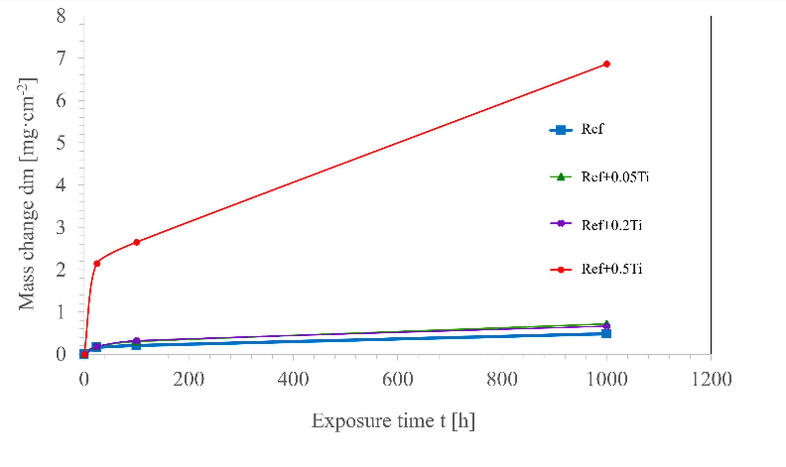 In summary, if specific functional property requirements (e.g., wear resistance) for the Ref alloy suggest the addition of titanium, it is recommended-based on high-temperature oxidation behaviour-to limit its content to a maximum of 0.2.