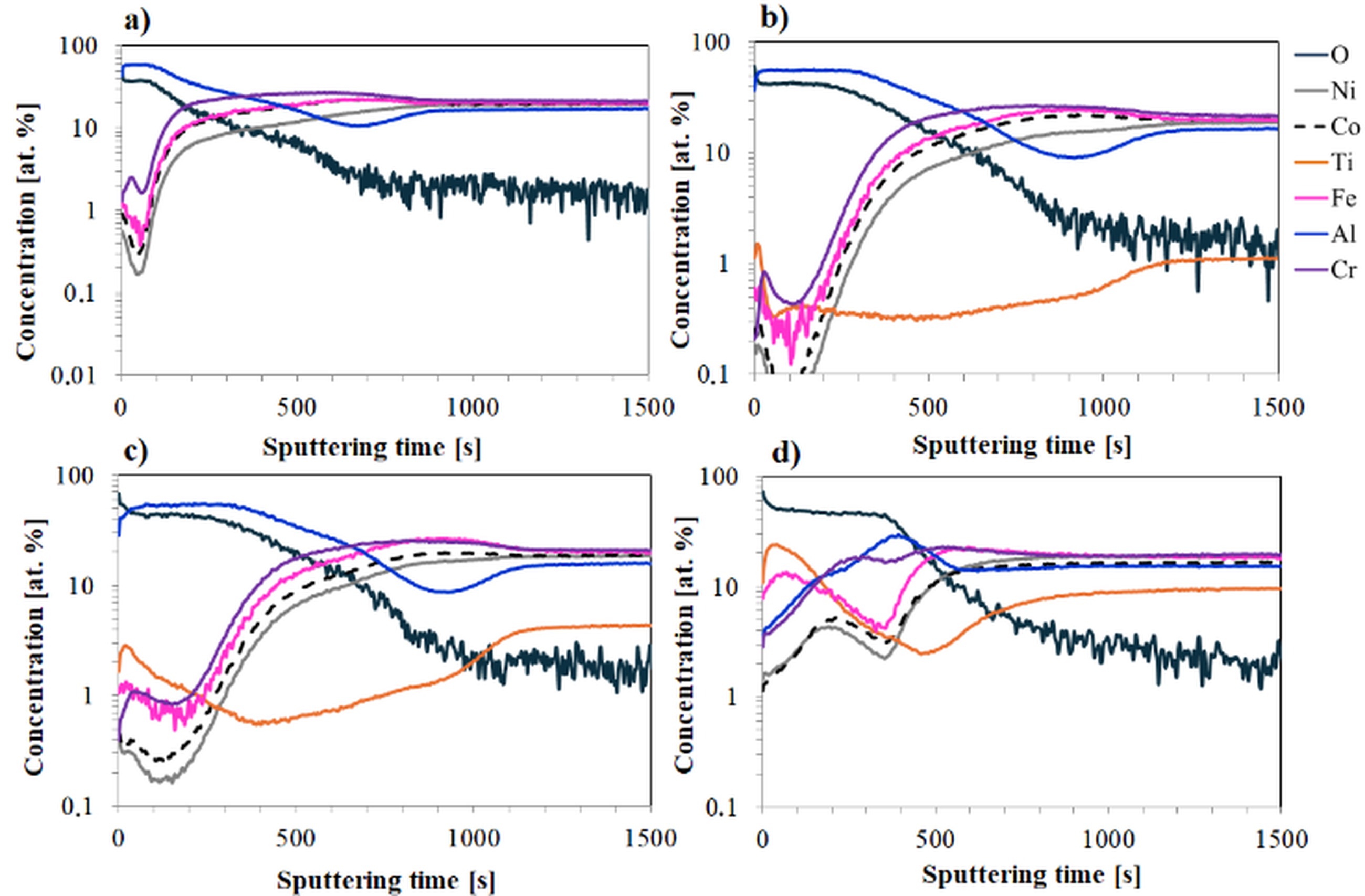 In the case of the Ref+0.2Ti alloy (Fig. 3c), the GD-OES profile shows a similar trend. However, a slightly higher presence of alloying elements is observed in the surface layer-approximately 1 at. % for chromium and iron, and around 0.2 at. % for nickel and cobalt. Titanium diffusion to the surface is also clearly visible.