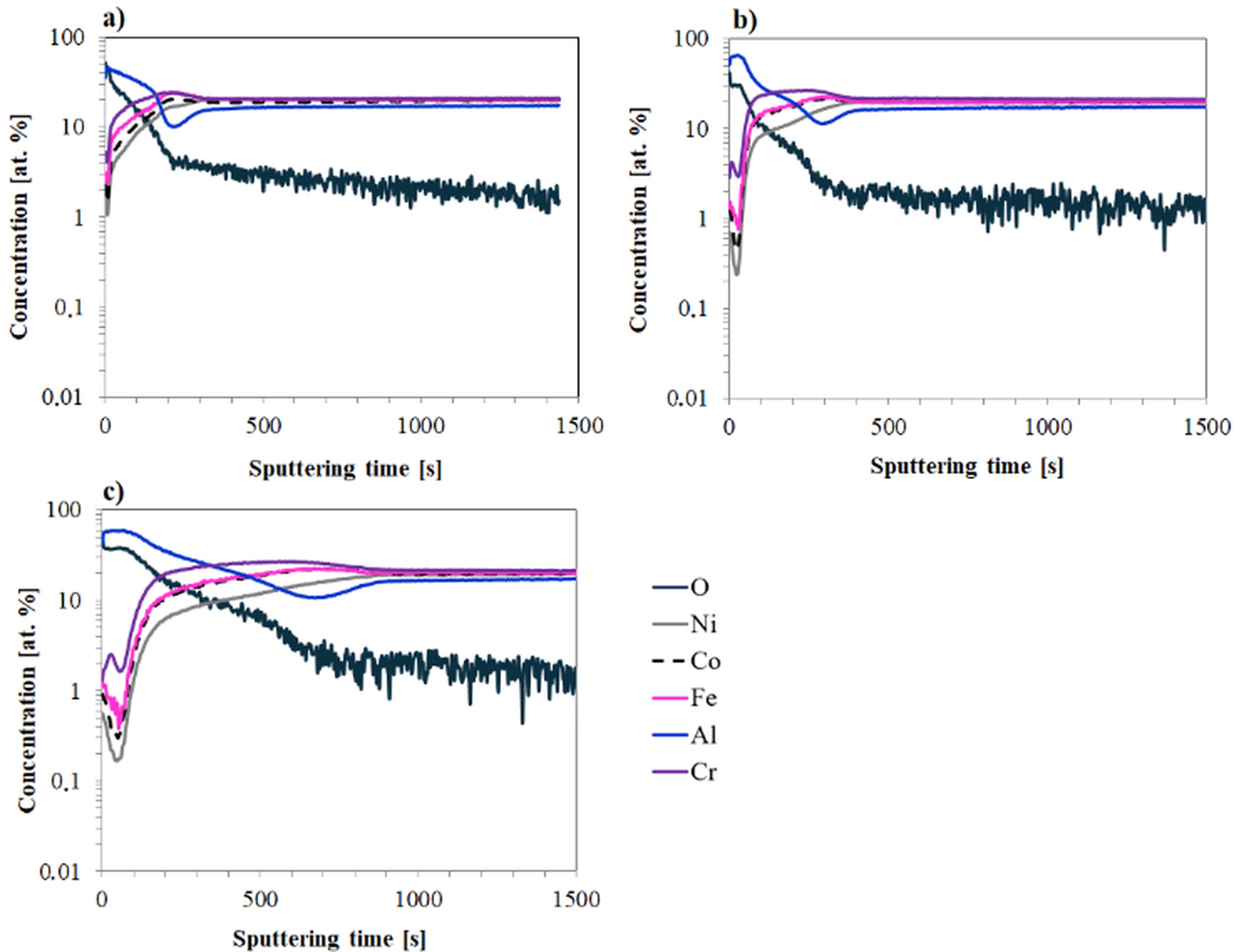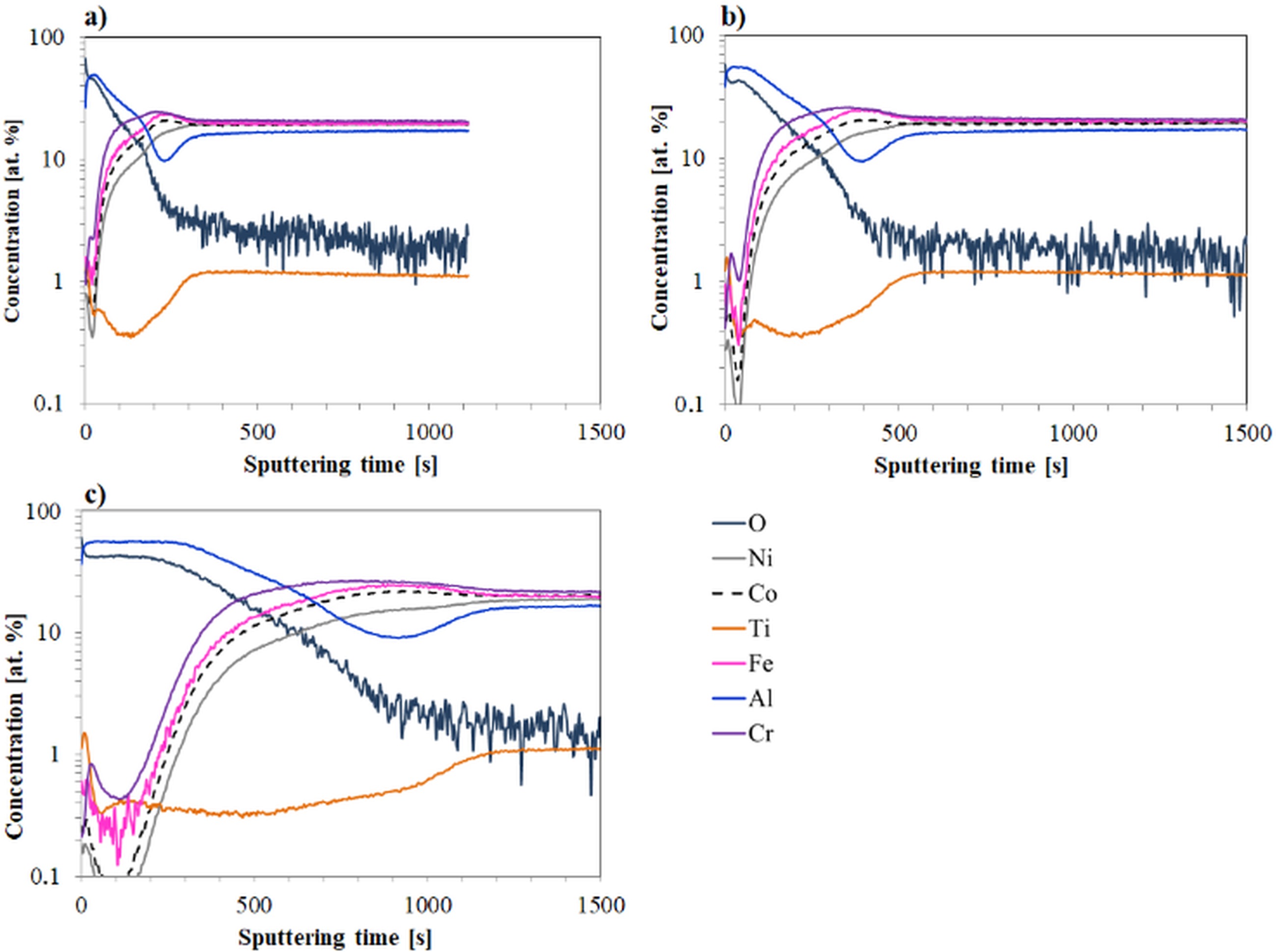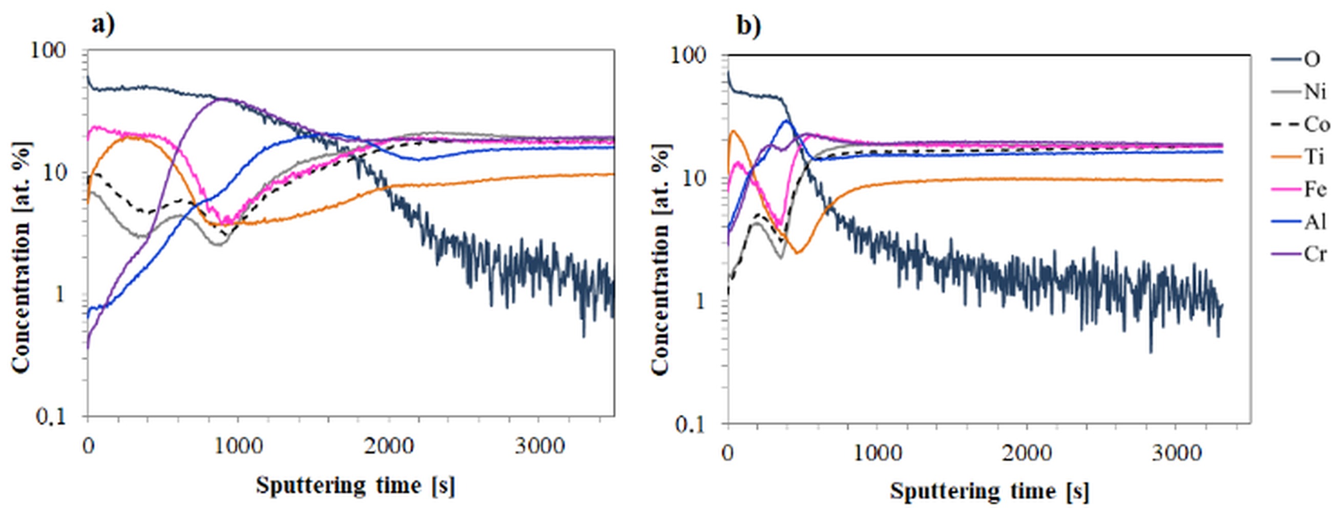 After 1000 hours of high-temperature oxidation of the Ref alloy (Fig. 3a), aluminum diffusion to the sample surface is clearly observed. The aluminum concentration changes with the oxygen content, indicating the formation of an aluminum oxide layer on the surface. Only at the depth of the layer corresponding to approximately 500-800 seconds of sputtering time is a slight depletion of aluminum compared to the bulk material, due to the diffusion of Al atoms to the surface. In contrast, the concentrations of the other alloying elements in the surface layer are significantly lower, what indicates formation of relatively pure Al2O3 oxide scale.
