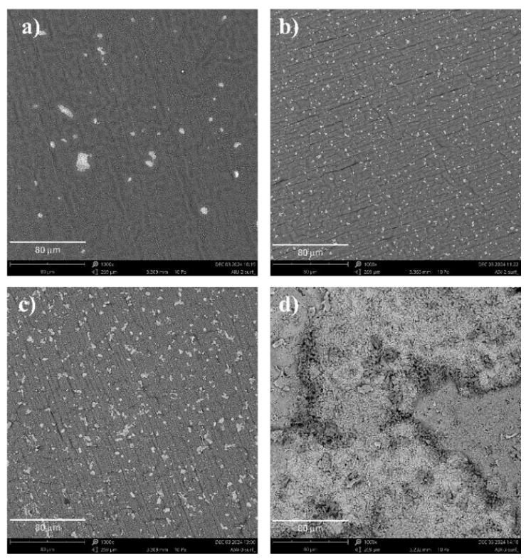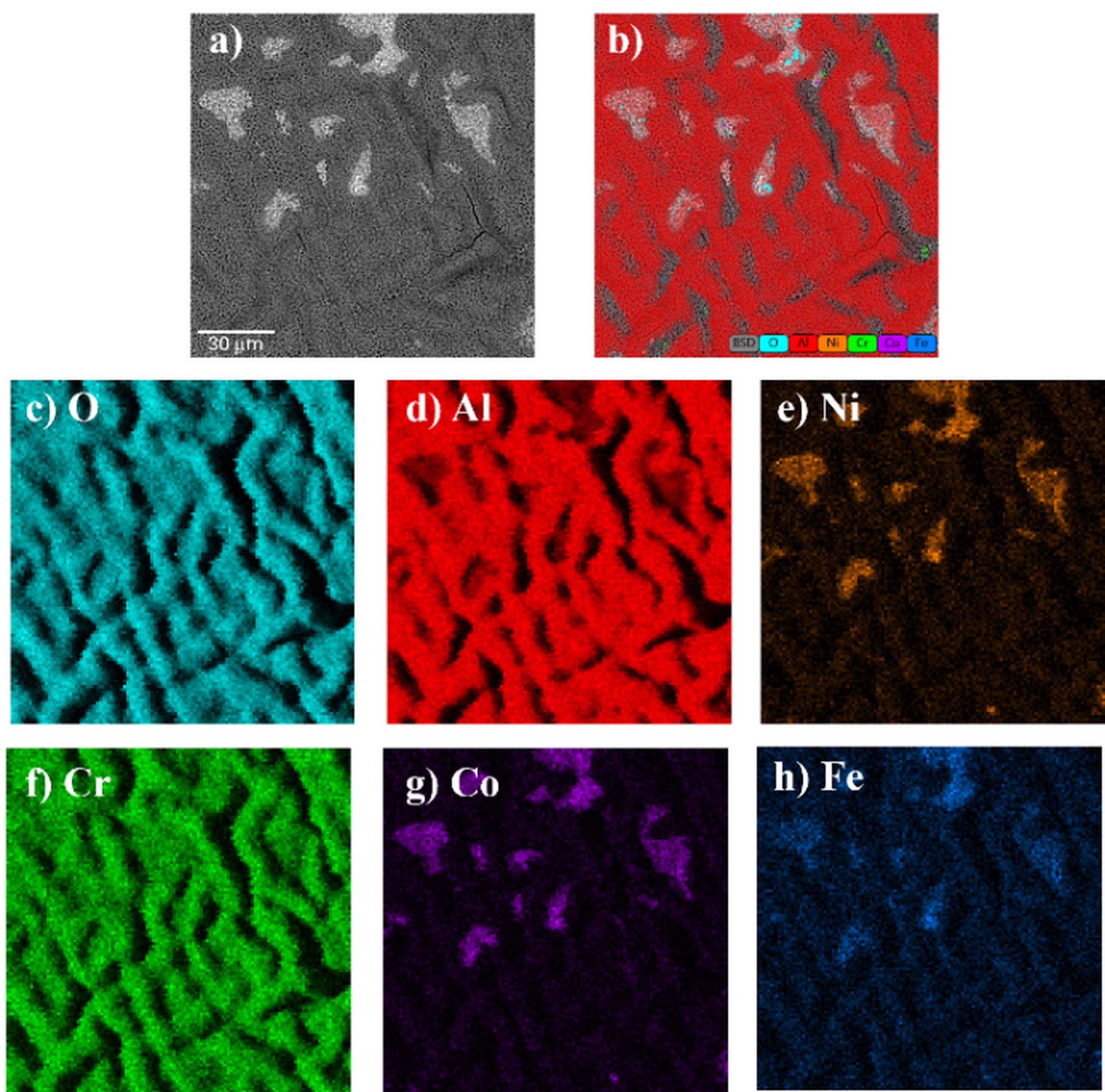 Figures 7-10 present microscopic images of the surfaces of the investigated materials after 1000 hours of high-temperature oxidation at 1000 °C. For direct comparison, Figure 11 presents the oxidation surface morphologies of all investigated alloys at the same magnification (x1000). On the surface of the Ref sample, an almost uniform aluminum oxide layer is observed, which is locally delaminated and cracked. Only in a few areas can bright spots be seen, corresponding to complex oxides of nickel, cobalt, and iron (Fig. 7e, g, h).