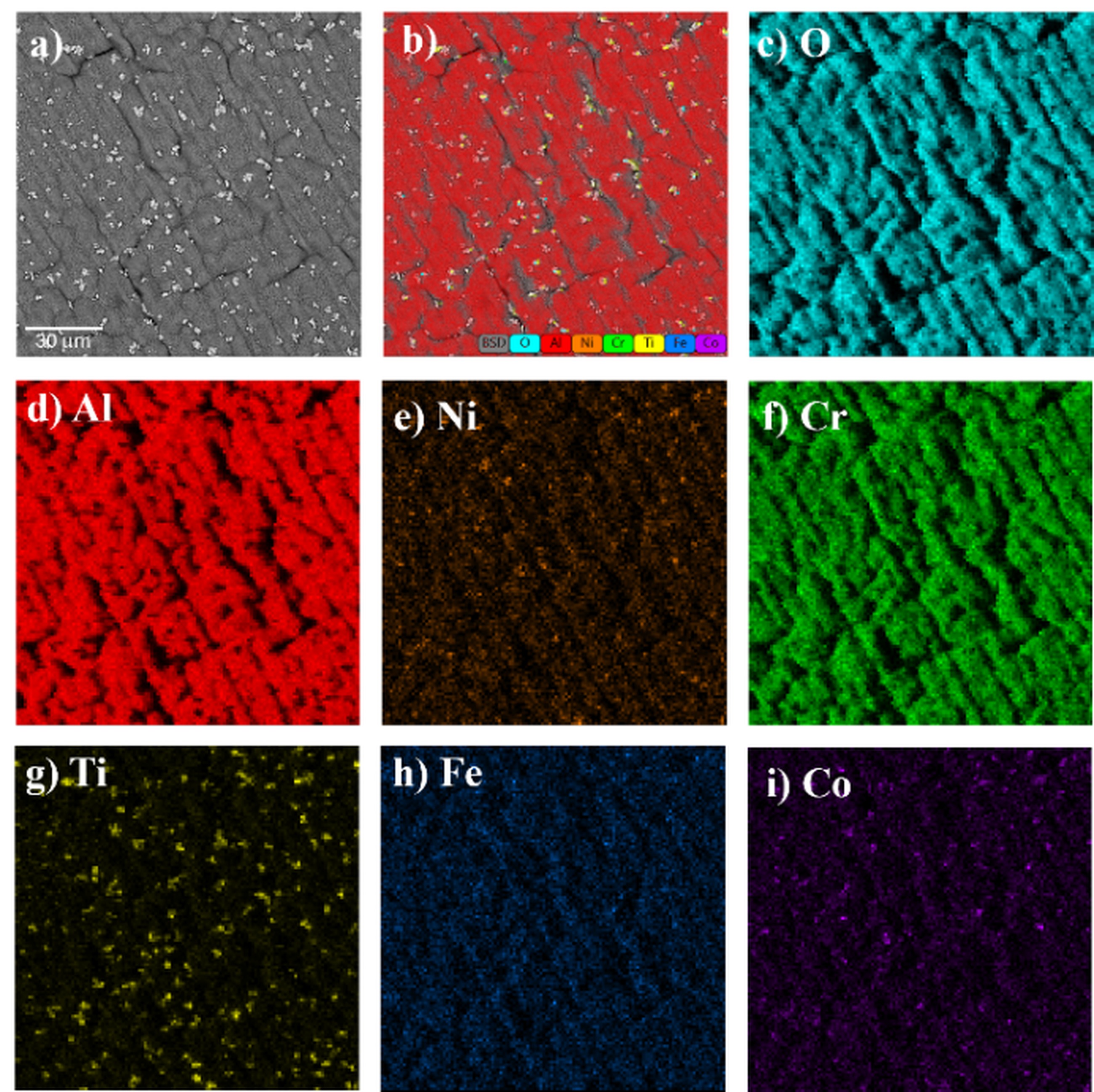 A similar surface morphology is observed for the Ref+0.2Ti alloy after high-temperature oxidation (Fig. 9). The sample surface reveals a continuous Al2O3 layer with numerous titanium oxide precipitates, as well as less frequent oxides of Co, Ni, and Fe.