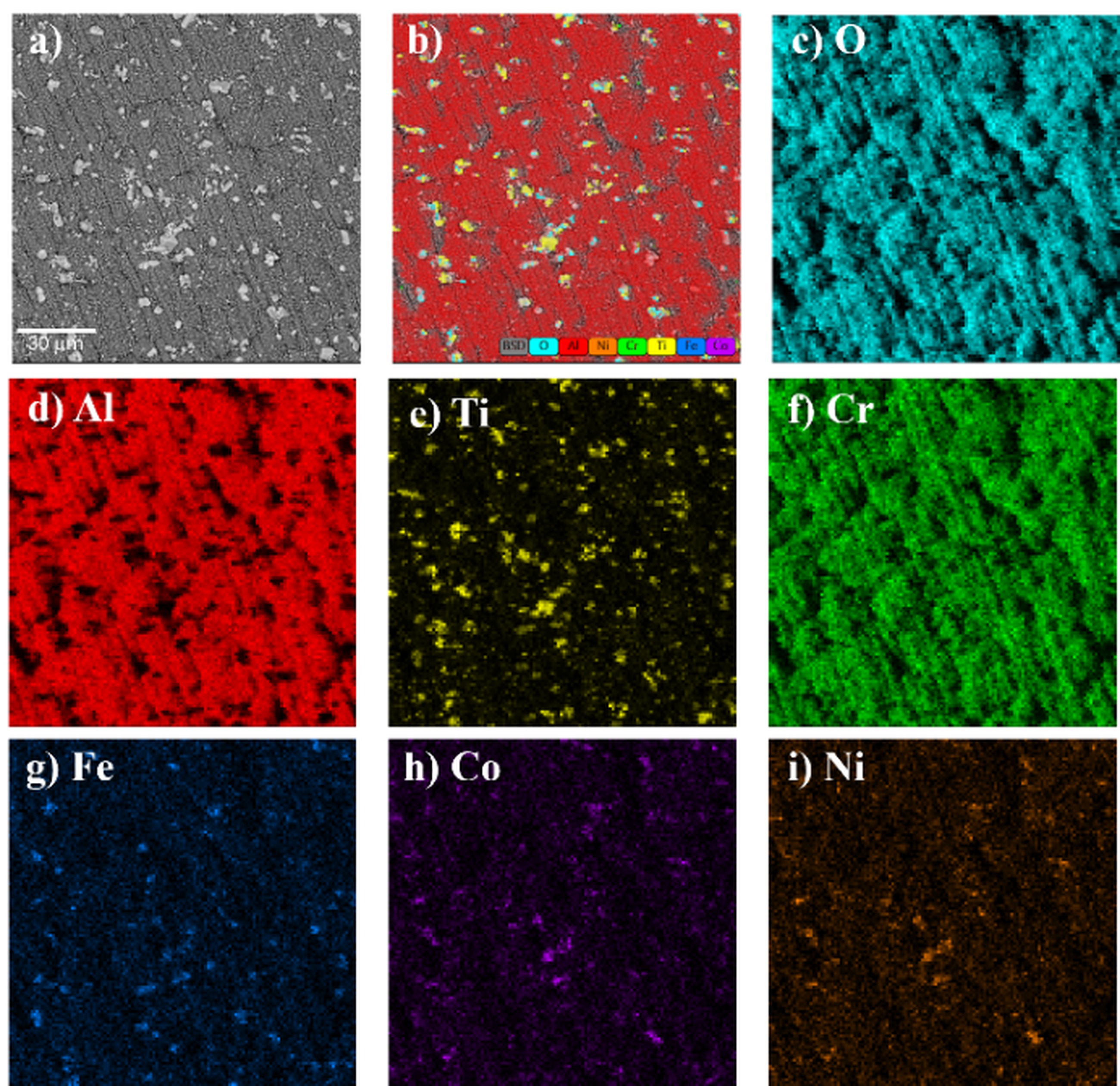 In contrast, the surface morphology of the Ref+0.5Ti sample appears entirely different. There is practically no aluminium in the outer oxide layer (Fig. 10b). The surface is dominated by complex oxides of Ni, Co, and Cr, along with large clusters of titanium-rich oxides (Fig. 10d).